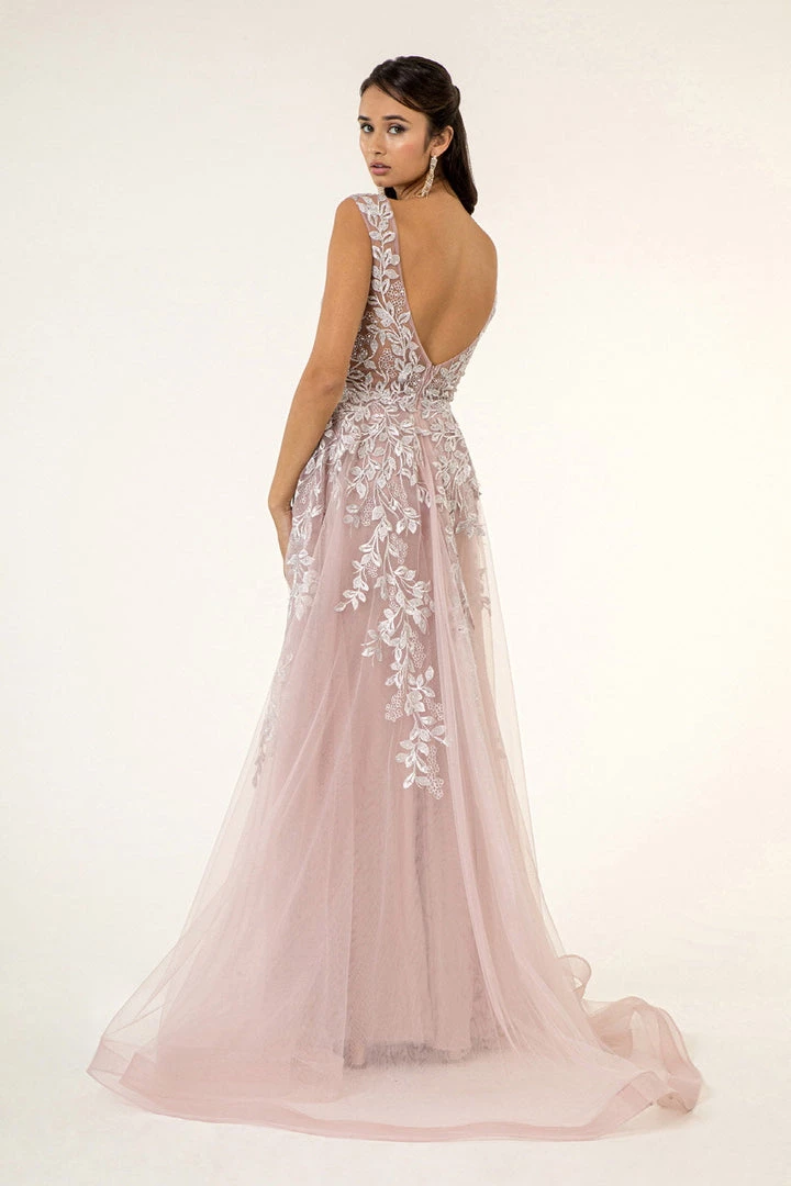 Remember the night in this long embroidered V-neck dress with fitted skirt Elizabeth K GL1920. Drop dead gorgeous embroidery and sparkly jewel embellished A-line dress! It also features 3-D floral appliques and airy mesh layer attached to waist to floor.