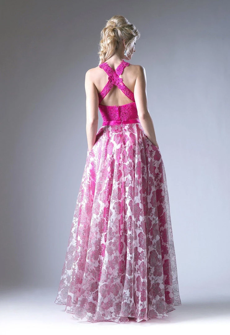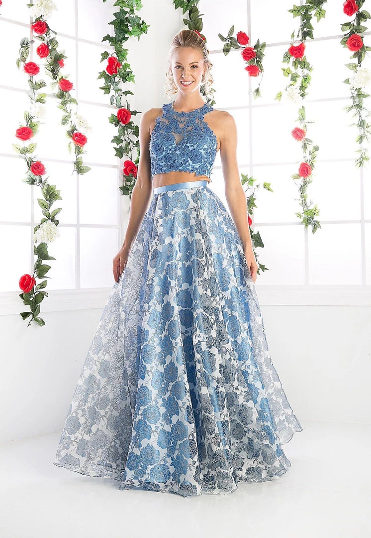 Fall in love with this long two piece dress with floral print skirt by Cinderella Divine KD099. A stunning two piece gown features a sheer bodice with sequins that create a flower pattern. The long skirt is a floral pattern and is a full skirt that falls to the floor. The waistline is belted with a stain sash. Fun and flirty.