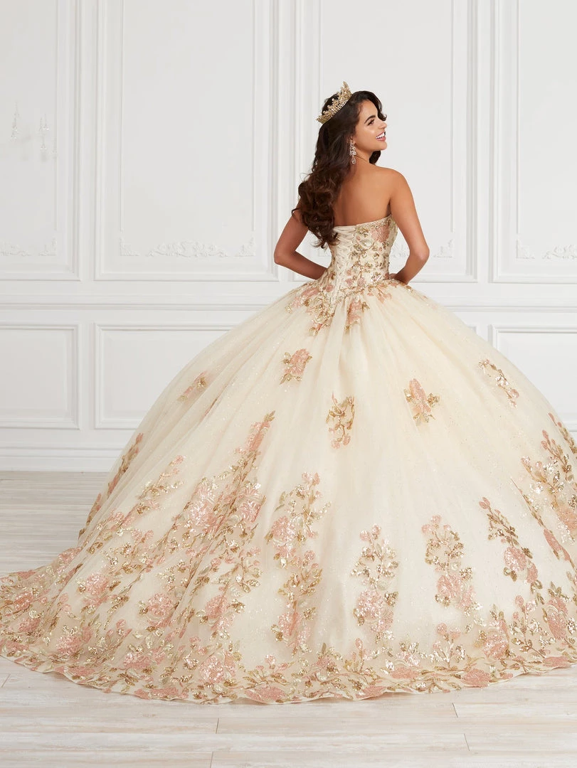 Make a grand entrance in this floral sequined long strapless dress with A-line skirt by House of Wu Quinceanera Collection 26976. Made out of tulle, this beautiful strapless ball gown features a sweetheart bodice adorned with sparkly beaded edge and sequined floral appliques, open back, and a floor length A-line tulle skirt embellished with floral appliques and horsehair hemline. This look is finished with a lace-up corset back and a sweep train.