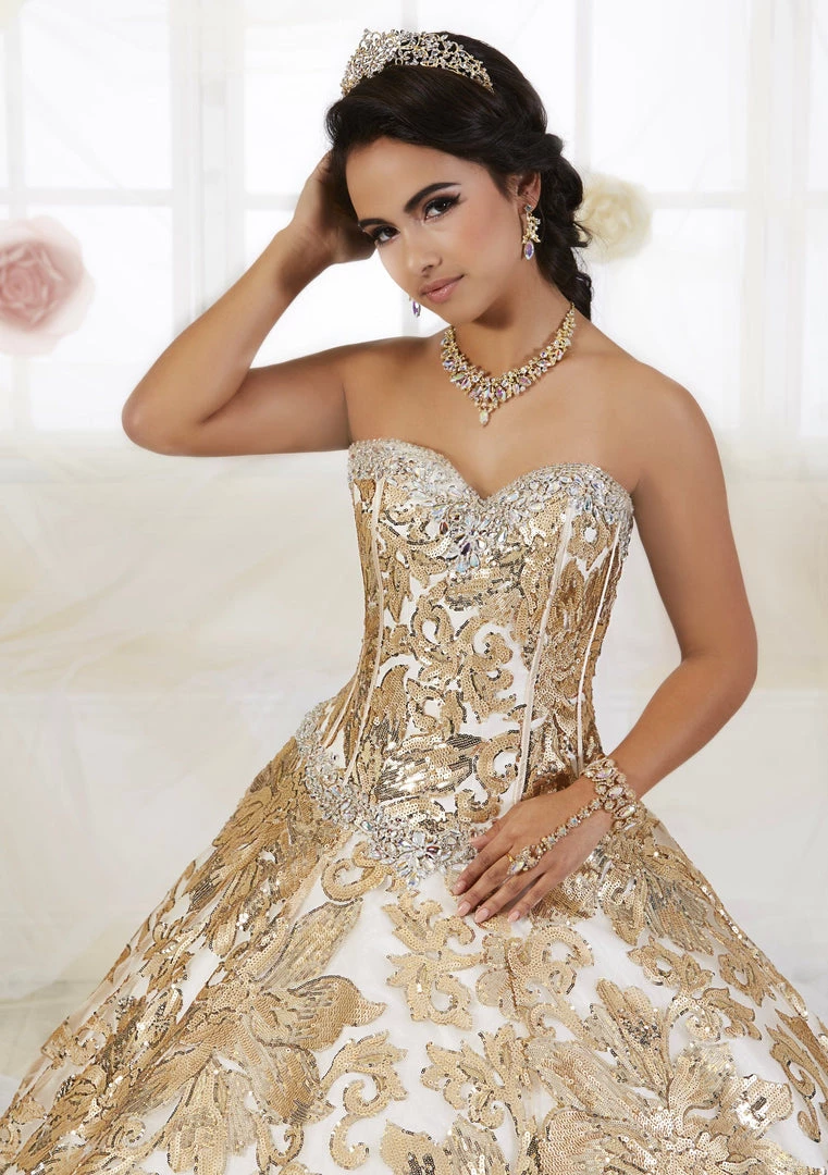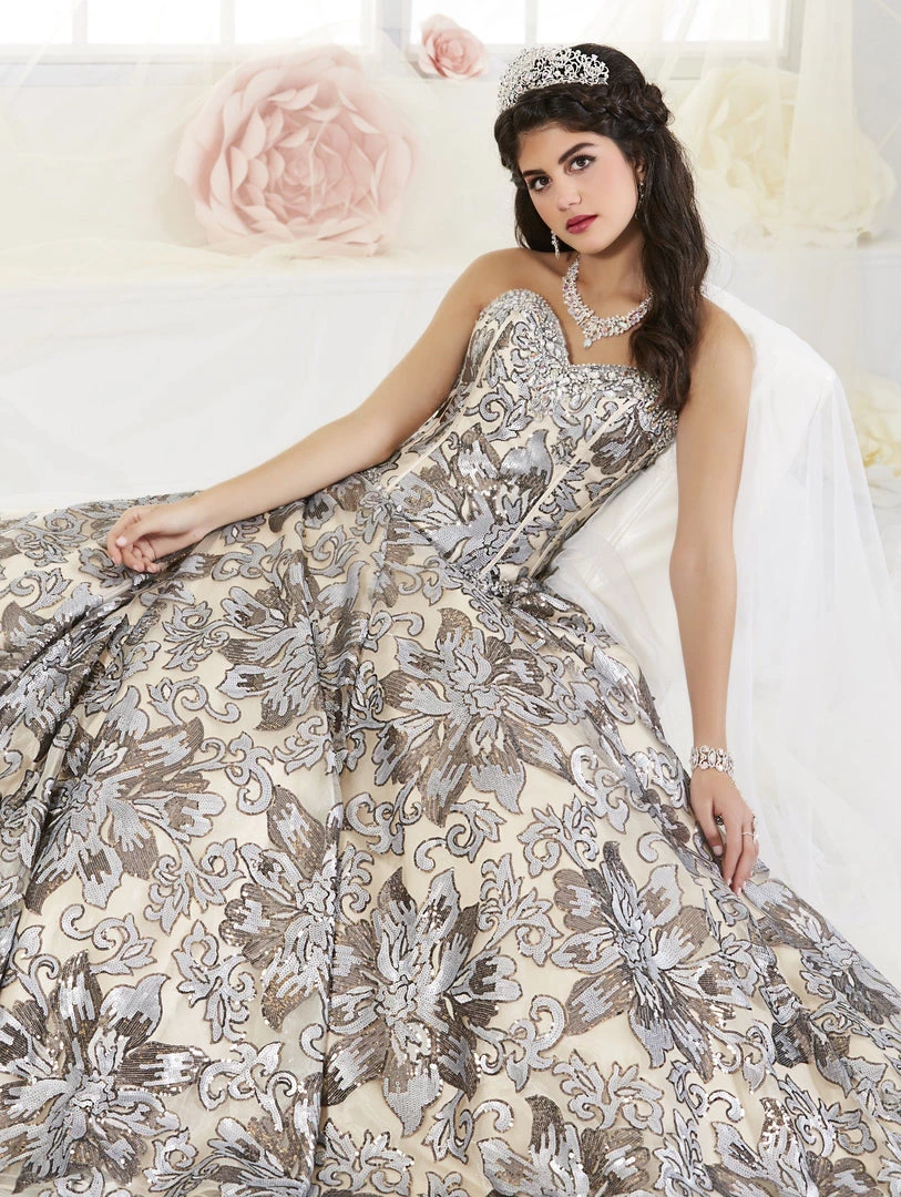 Look unforgettable in this floral sequined A-line dress by House of Wu Quinceanera Collection 26909 during your Quinceanera, Sweet 16 party, or for any formal event. This princess ball gown features a decorative floral sequin pattern. The strapless bodice is accented with statement beading around the sweetheart neckline and waist. This look is finished with lace up back.