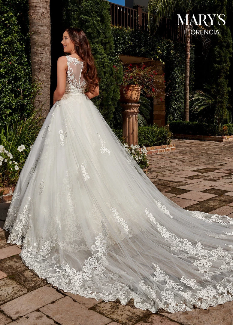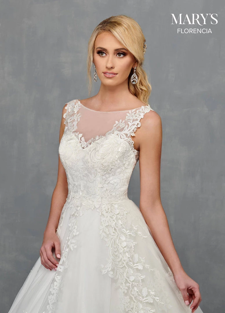 Look radiant in this long sleeveless wedding dress with A-line skirt by Mary’s Bridal Florencia Collection MB3115. Traditional A-line wedding dress with a sheer cap sleeve yoke and delicate lace applique throughout. The floor length gown has been adorned throughout with matching lace applique. The gown finishes with a sheer back yoke, covered button closure and a full semi-cathedral length detachable train accented with matching applique.