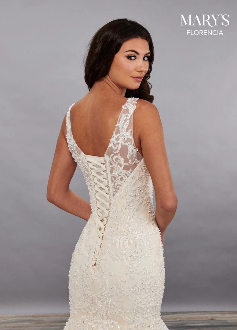 Look timeless in this long sleeveless wedding dress with fitted skirt by Mary’s Bridal Florencia Collection MB3093. Traditional fit and flare lace applique wedding/bridal dress with a sweetheart neckline and crystal beaded applique throughout. The gown features sheer straps, a lace up back closure and a fully embellished chapel length train.