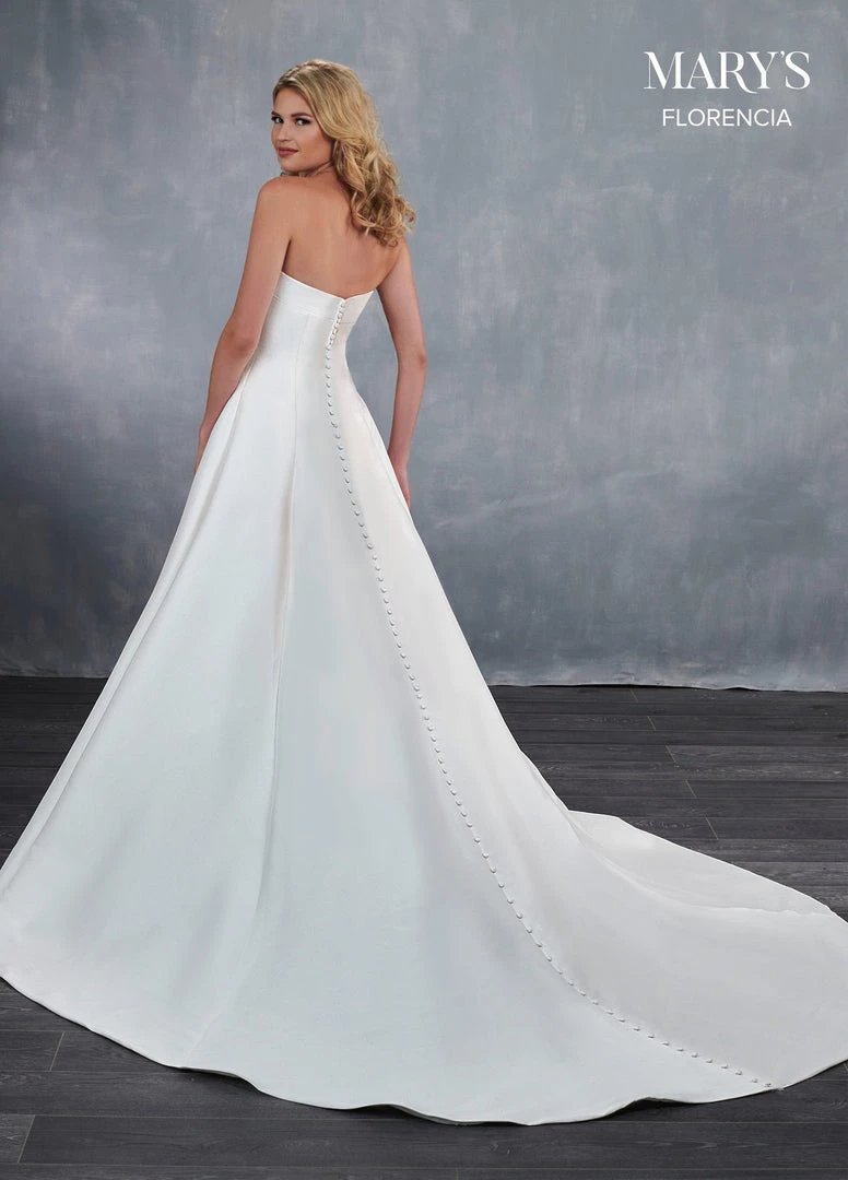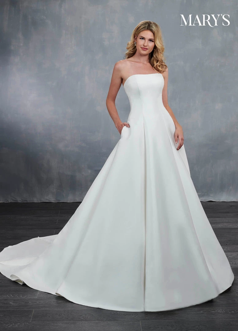 Look timeless in this long strapless wedding dress with A-line skirt by Mary’s Bridal Florencia Collection MB3051. Classic mikado wedding/bridal dress with a strapless neckline, full princess line silhouette and a detachable modified bow detail. The gown features matching covered buttons, side seam pockets and a full chapel length train.