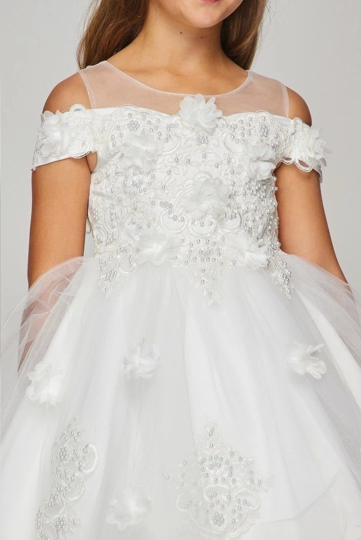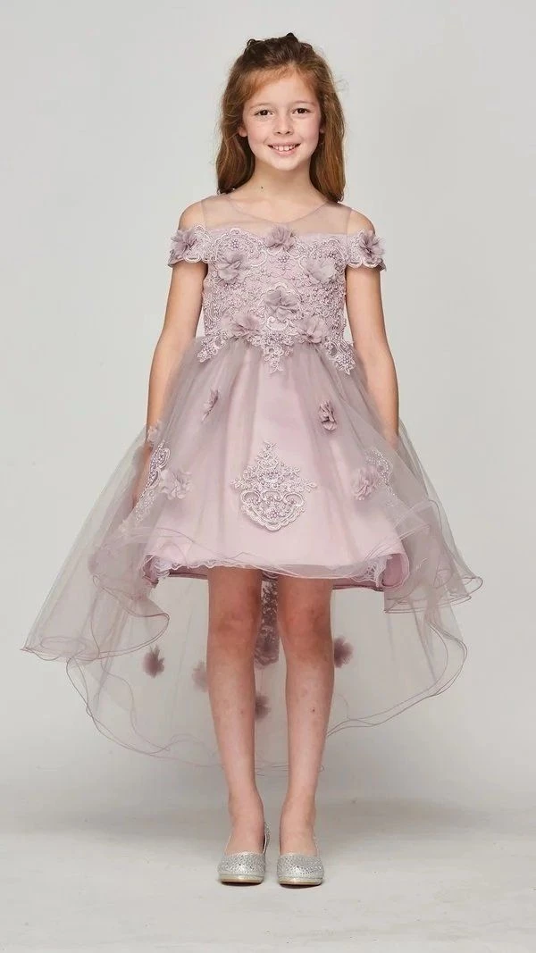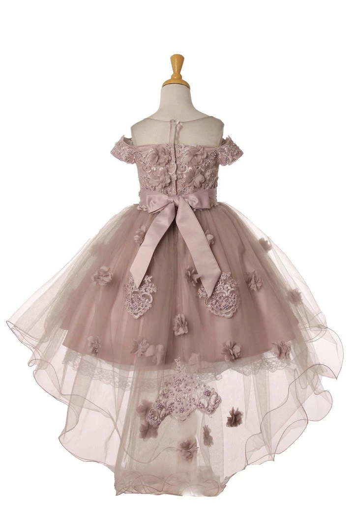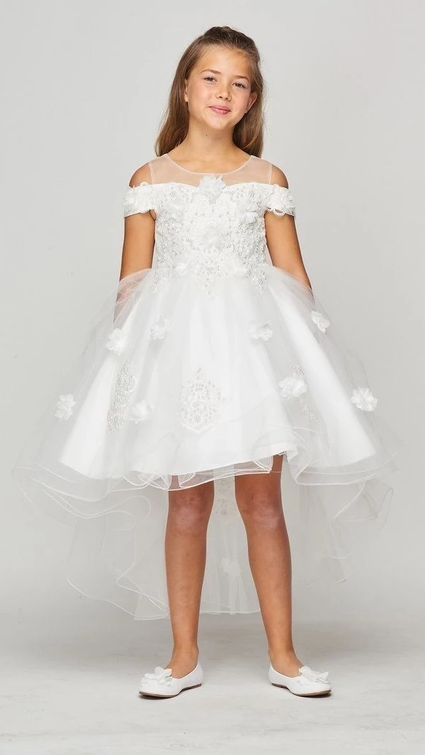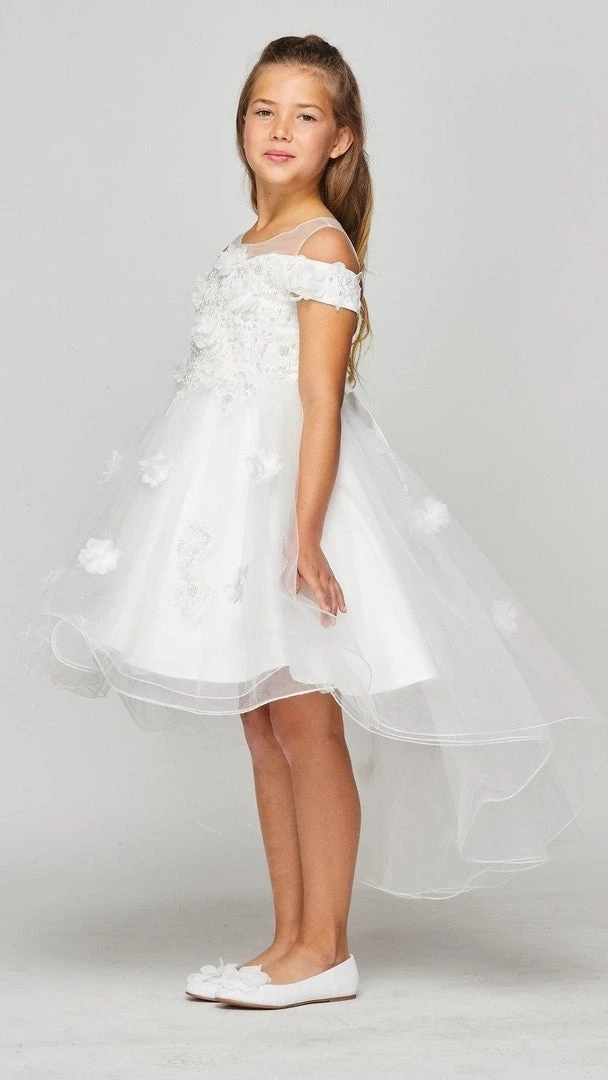 Your sweet girl will light up the room in this 3D floral cold shoulder high low dress with A-line skirt by Cinderella Couture 9119. Elegant hand-crafted lace appliques with sequin pearl beads shining, this off shoulder hi-low dress has 9 layers of skirt including cotton lining, bask sash tie.