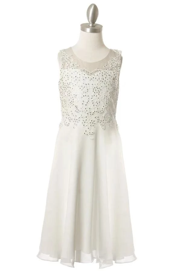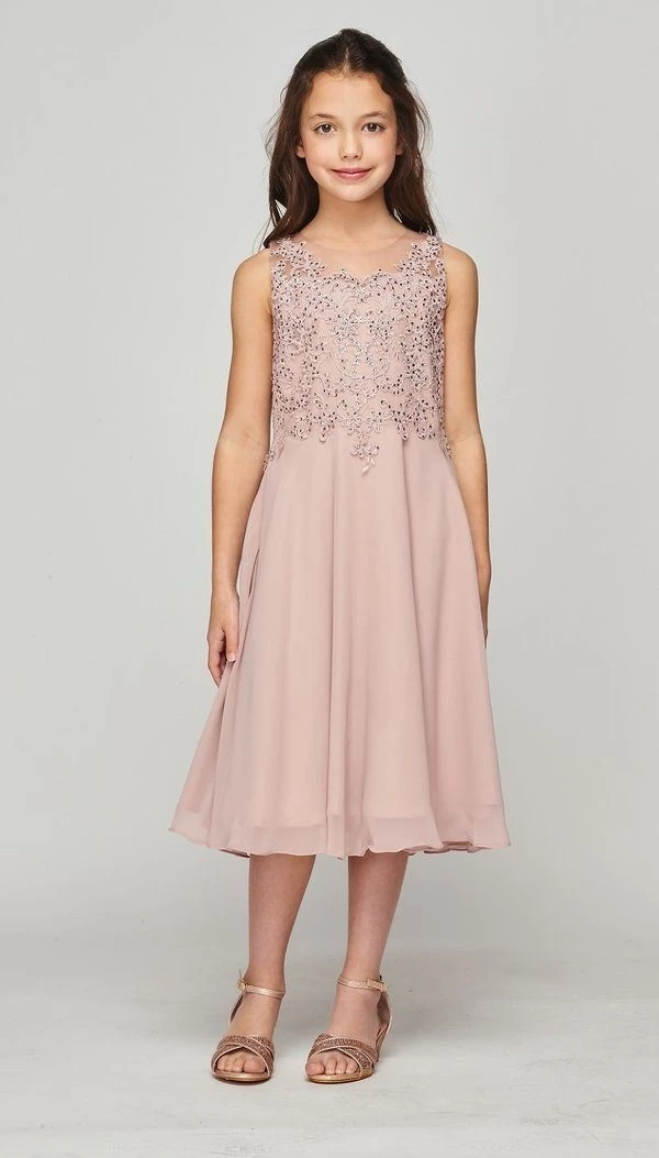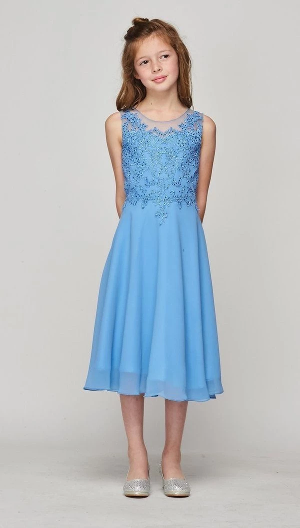 Your sweet girl will look timeless in this lace applique sleeveless tea length dress with A-line chiffon skirt by Cinderella Couture 5089. This sophisticated chiffon tea length dress features a beaded lace appliqued bodice, sheer back, and an invisible zipper back.