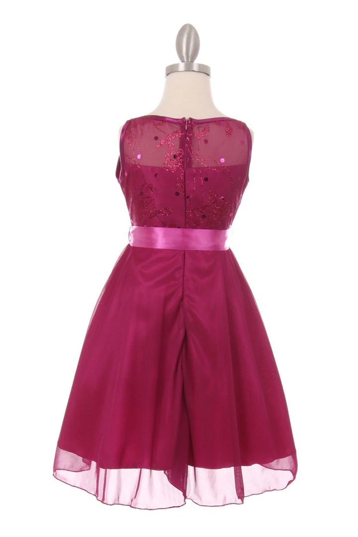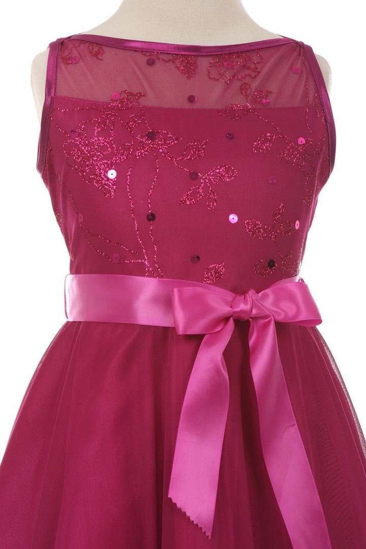 Your sweet girl will sparkle and shine in this chiffon dress with glitter print bodice by Cinderella Couture 1218. Cute glitter sequin dress chiffon mesh dress with ribbon sash and a sleeveless illusion bodice.