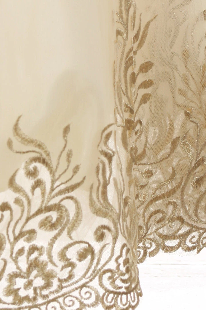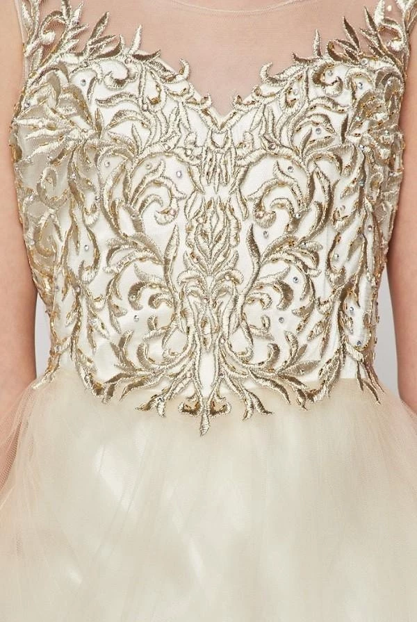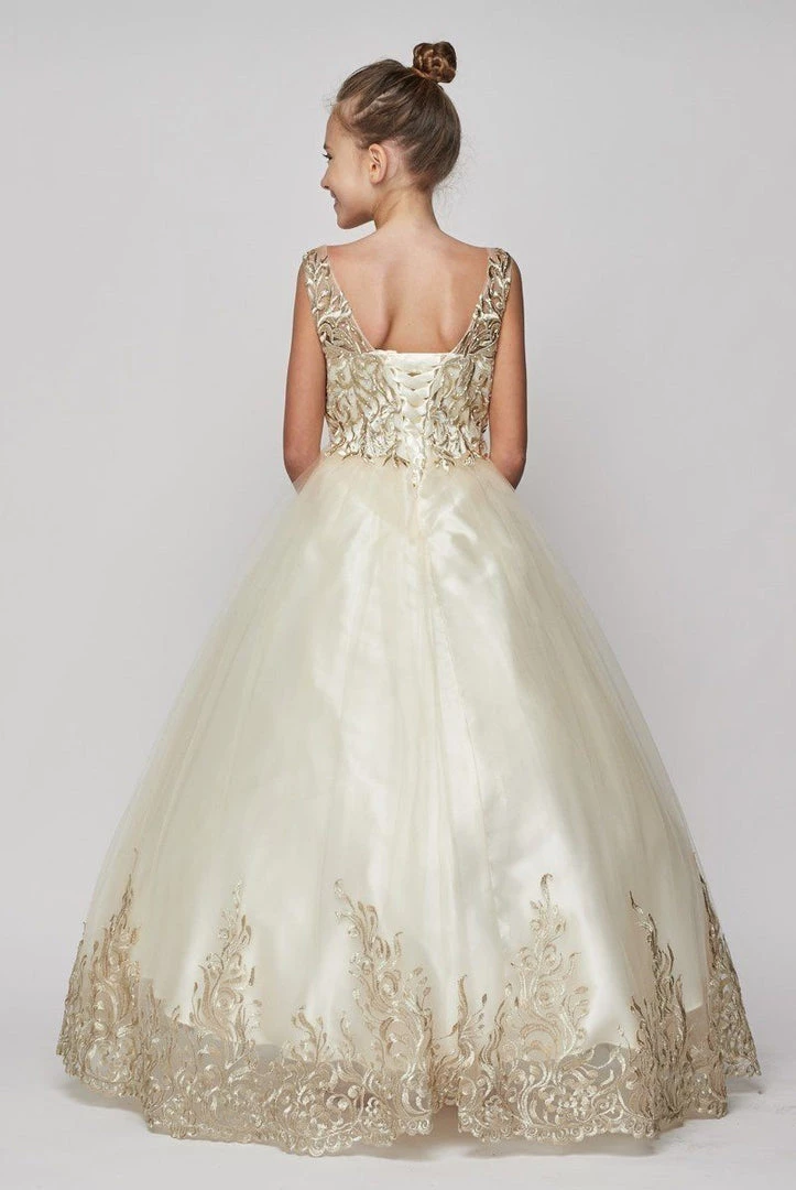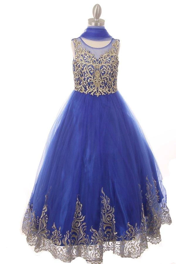 Your sweet girl will be the center of attention in this long embroidered dress with corset back by Cinderella Couture 8004. This elegant dress features an illusion sweetheart sleeveless bodice, gold embroidery adorned with beaded embellishments, open back, long A-line skirt with a full hard net lining, and a lace-up corset back. A matching scarf is included.