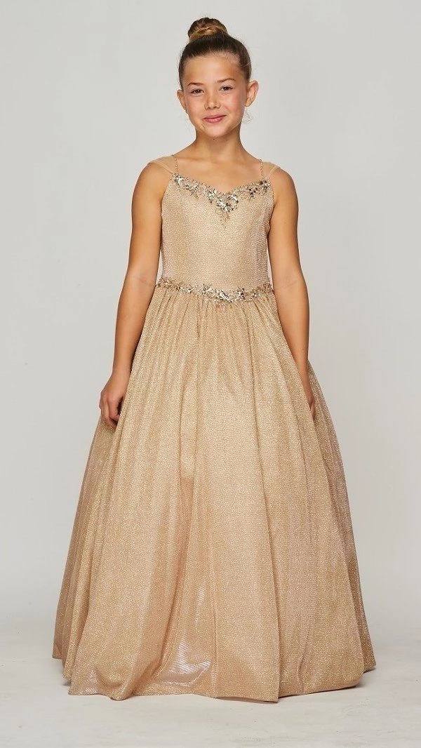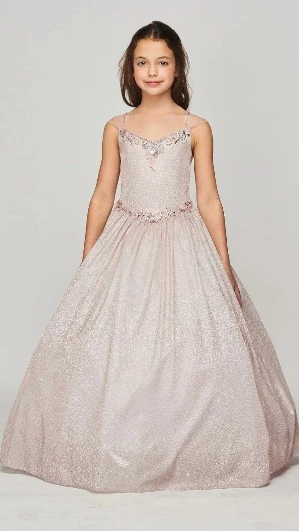 Your sweet girl will be the center of attention in this metallic glitter ball gown with corset back by Cinderella Couture 5087. This beautiful dress features a sweetheart bodice, hand crafted rhinestones and sequins on the neckline and waistline, tulle cap sleeves, sheer sides, side pockets, open back with keyhole cutout, long A-line skirt, and a lace-up corset back.