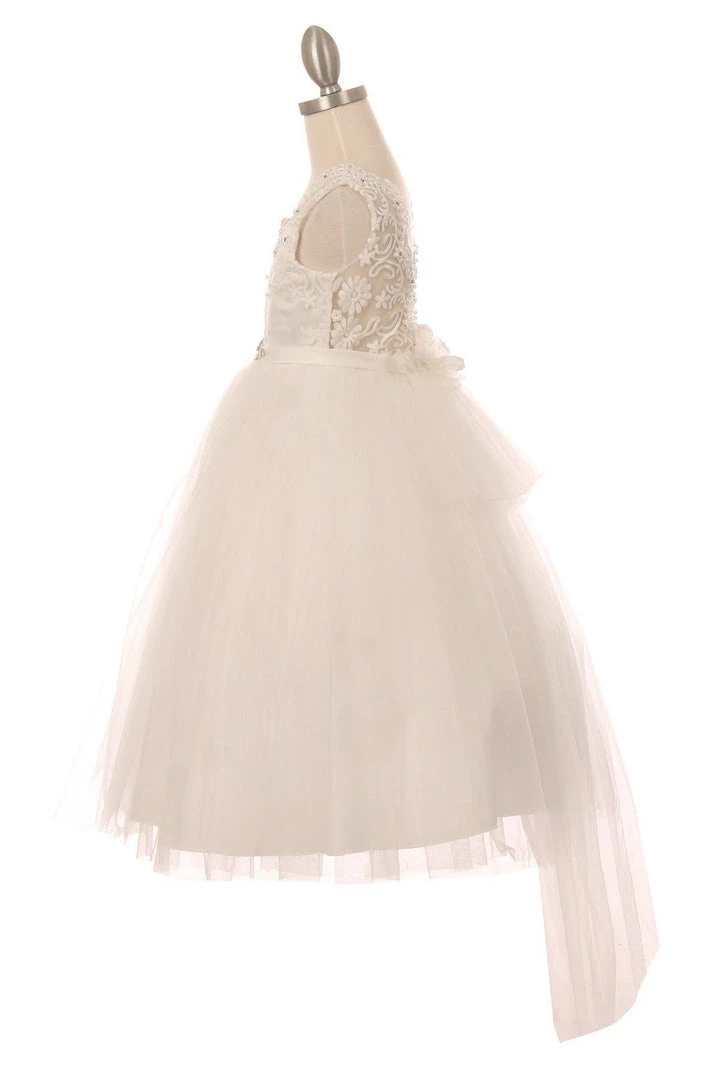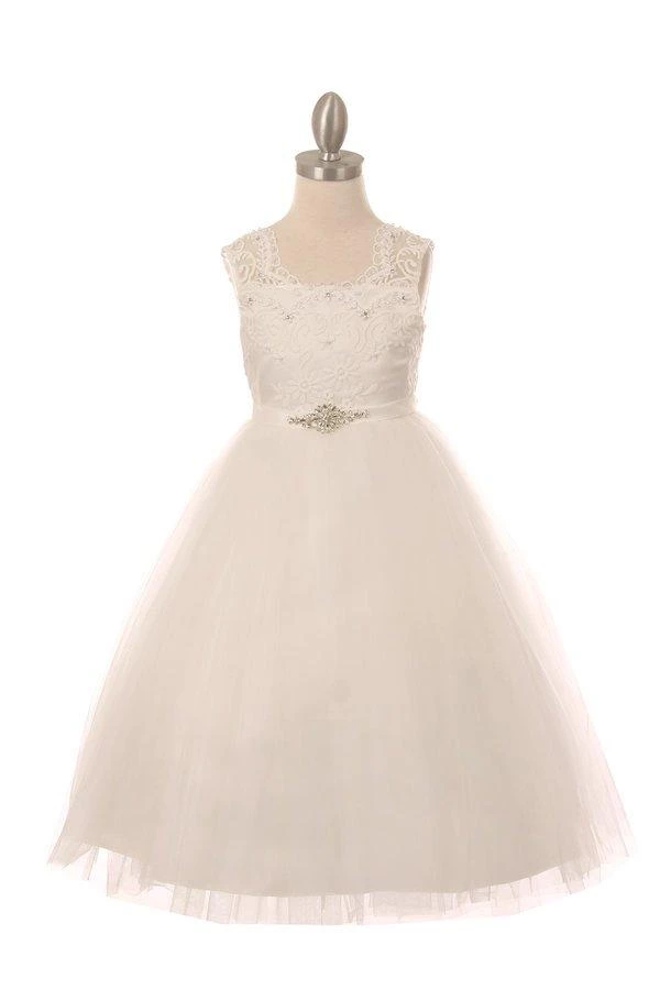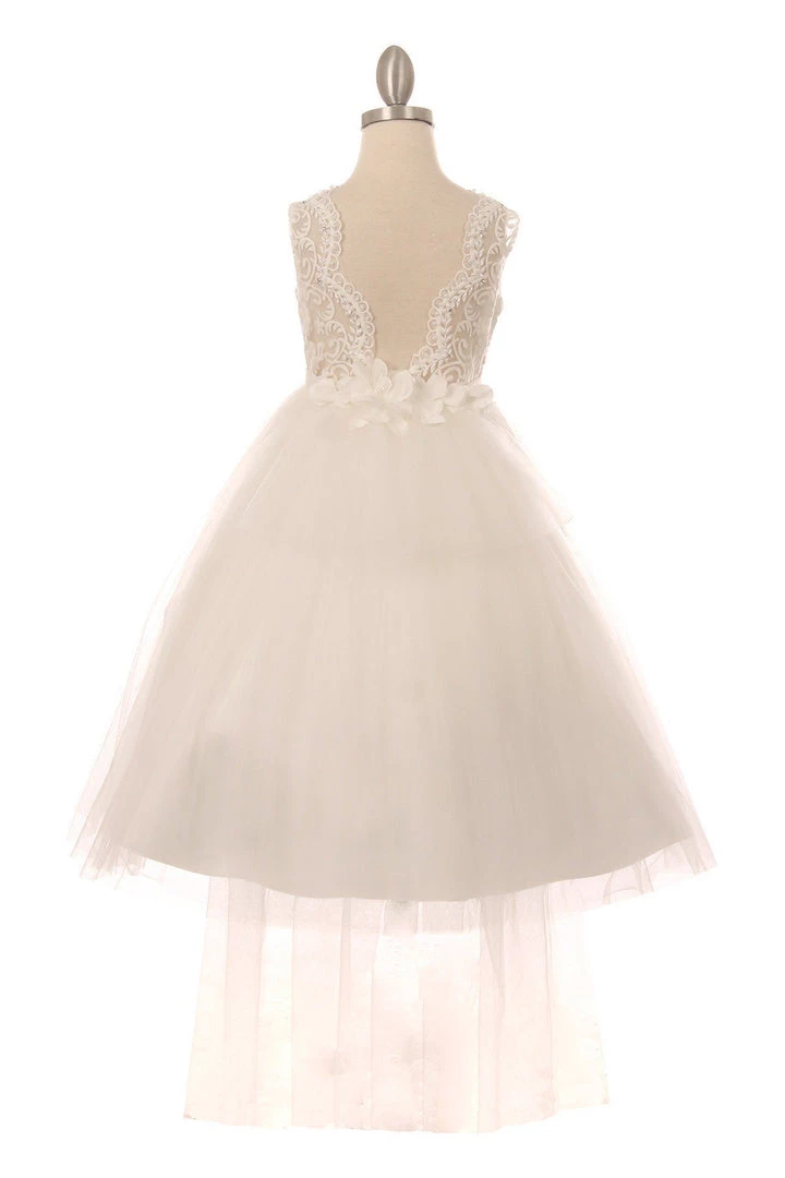 Your sweet girl will be the center of attention in this long sleeveless dress with lace bodice by Cinderella Couture 5079. Elegant beaded lace top with a quality rhinestone buckle and tulle skirt, open V-back, long A-line tulle skirt with detachable back tail flower, and a zipper closure.