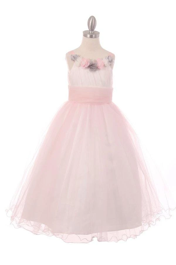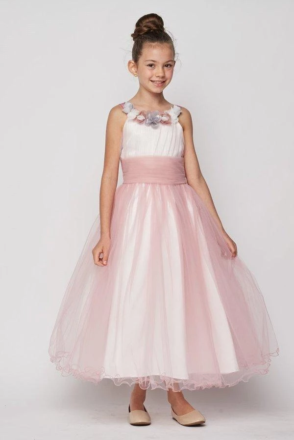 Your sweet girl will be the center of attention in this two tone tulle gown with flower neckline by Cinderella Couture 9074. Elegant two tone accordion crinkled, tulle ankle length dress with multi colored floral front and back neckline. Beautifully finished with removable mesh tulle bow.