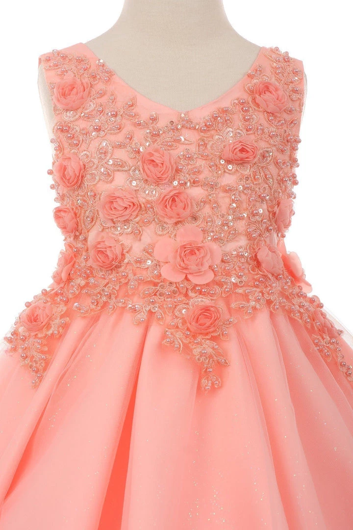 Your sweet girl will receive lots of compliments in this short glitter dress with 3-dimmensional flowers by Cinderella Couture 9020. This beautiful sleeveless short dress features a scoop bodice adorned with pearl beaded 3D floral appliques, enclosed back, zipper closure with back tie sash for better comfort, and a short A-line glitter skirt.