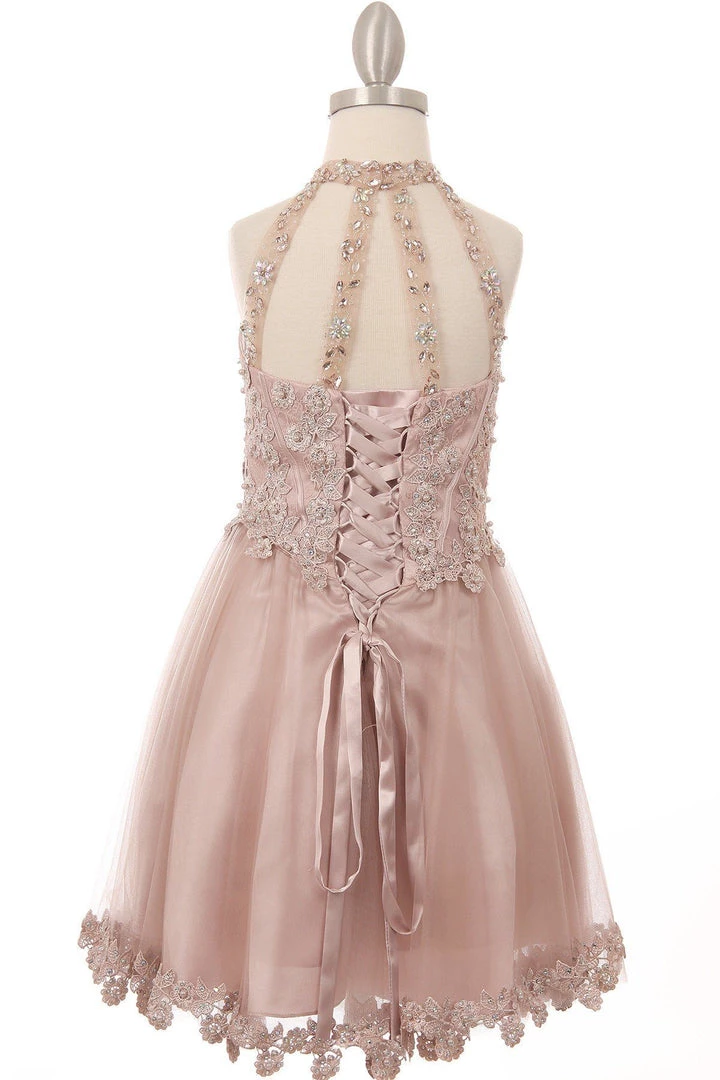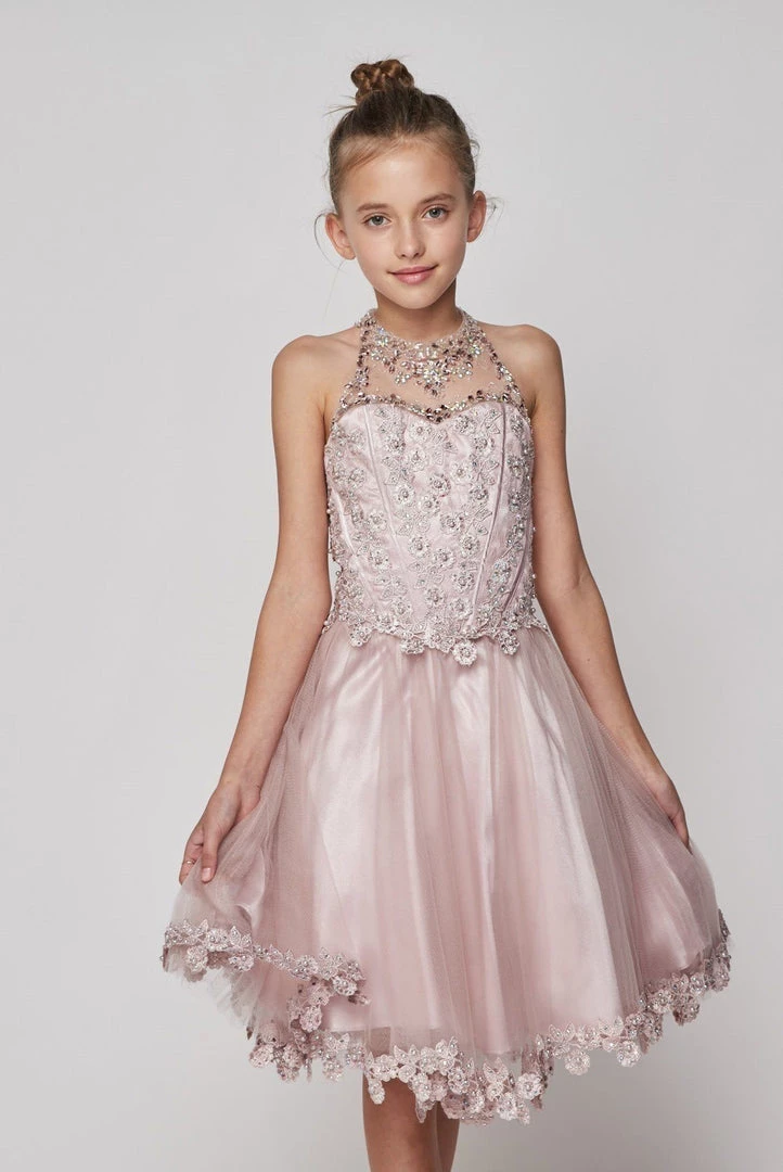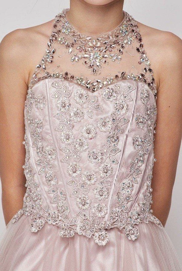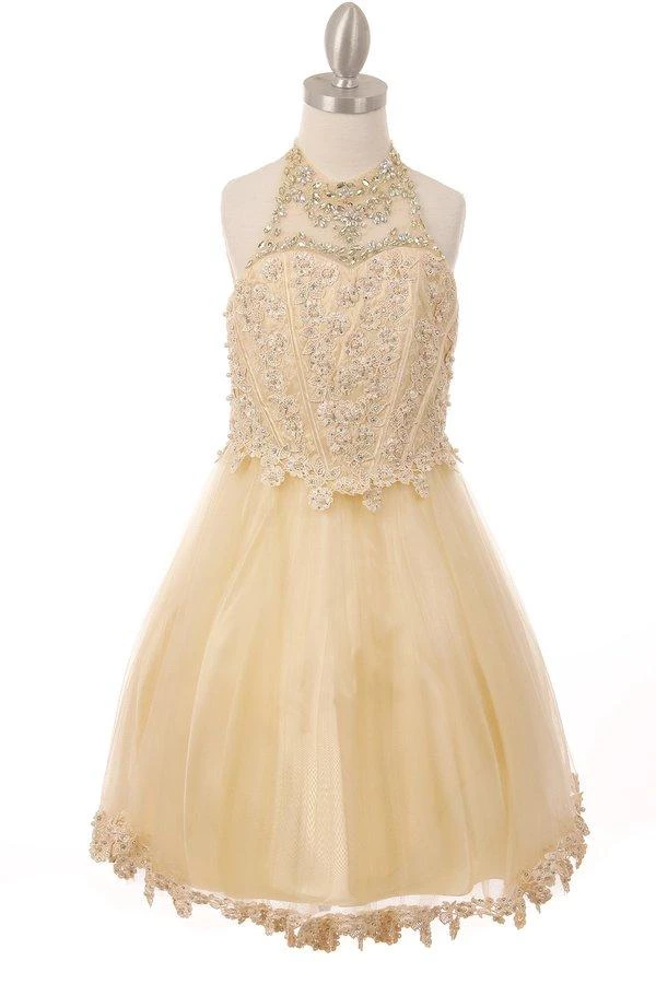 Your sweet girl will receive lots of compliments in this short halter illusion dress with beaded lace appliques by Cinderella Couture 8500. This party dress features a sheer halter neckline with pearls and jeweled beads, rhinestone and sequin bodice with pearled and rhinestone flower lace on the bottom of the skirt, and lace up back.