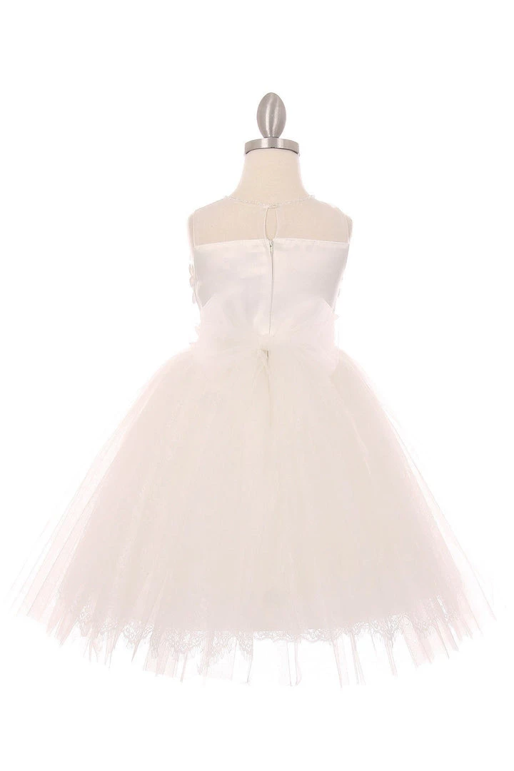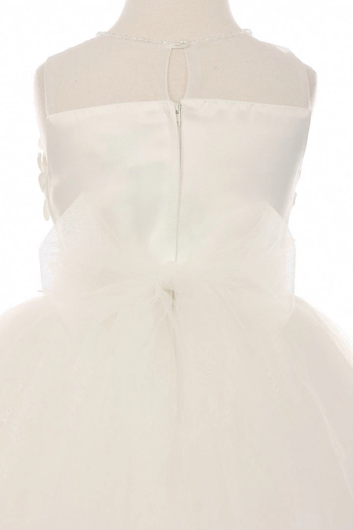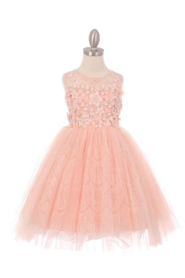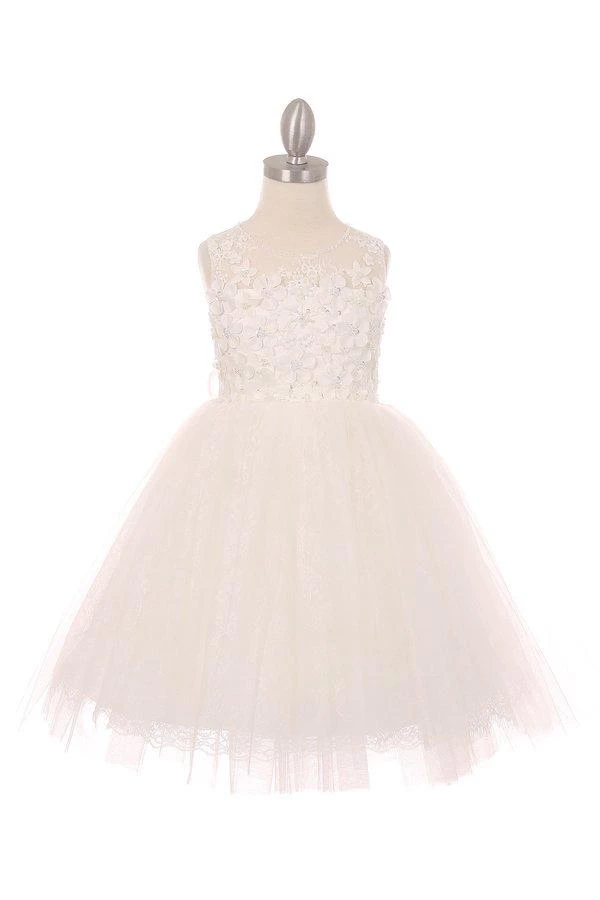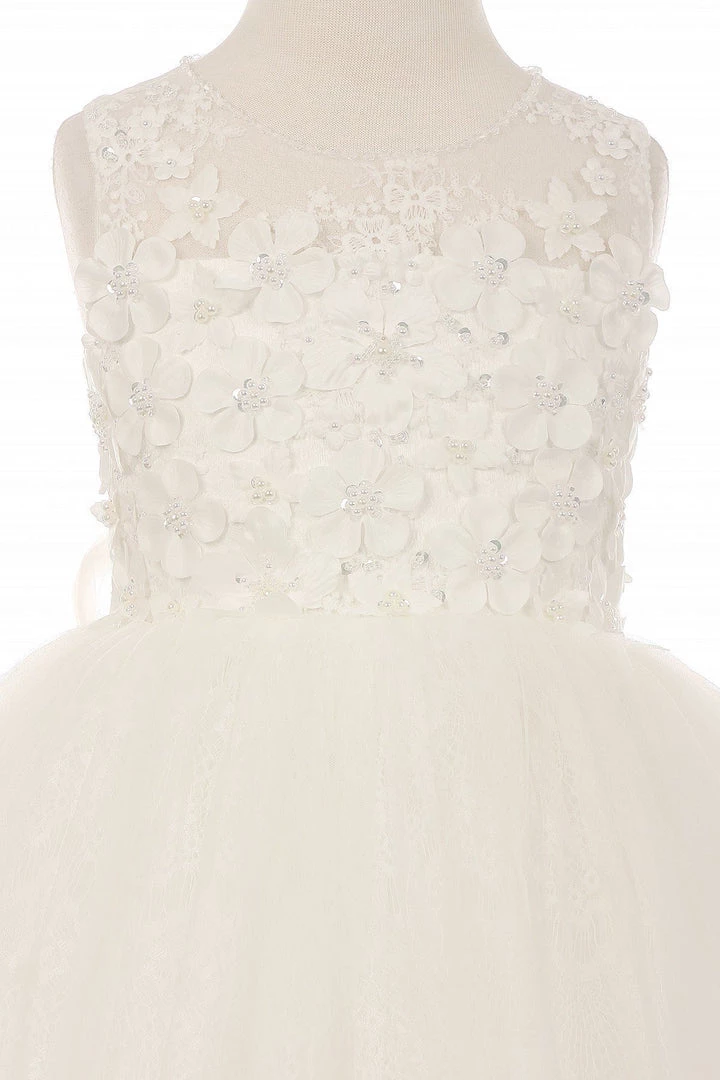 Your sweet girl will look picture-perfect in this short lace dress with 3-dimensional flowers by Cinderella Couture 9032. This elegant dress features a sleeveless illusion bodice adorned with 3D floral appliques accented with lovely beads, short A-line lace skirt overlaid with tulle for a soft look, and a back sash with a zipper closure.