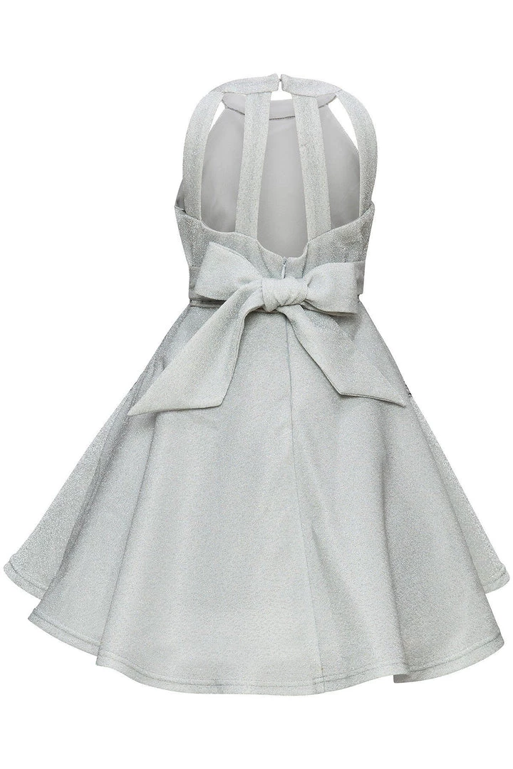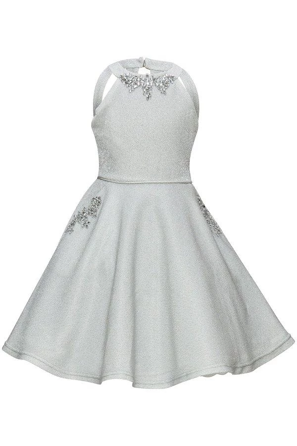 Your sweet girl will be selfie ready in this short halter metallic dress with A-line skirt by Cinderella Couture 5085. Shiny metallic rhinestone halter neck, 180 degree skater short dress with side pockets, rhinestone beaded embellishments, invisible zipper back closure, and back sash ribbon.