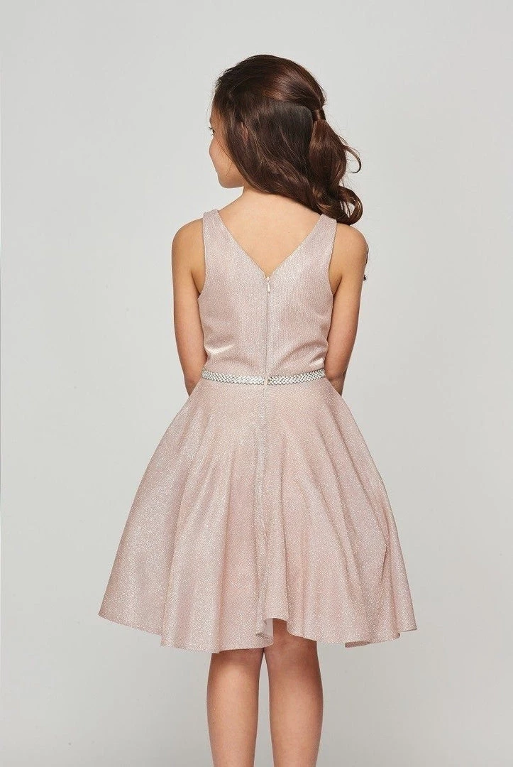 Your sweet girl will light up the room in this short V-neck metallic glitter dress with A-line skirt by Cinderella Couture 8013. This short party dress features a sleeveless V-neck bodice, tank straps, beaded waistband, open V-back, side pockets, short A-line skirt, and an invisible zipper back.