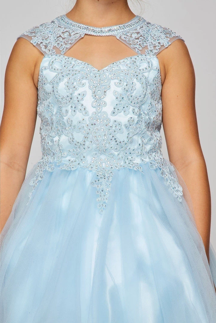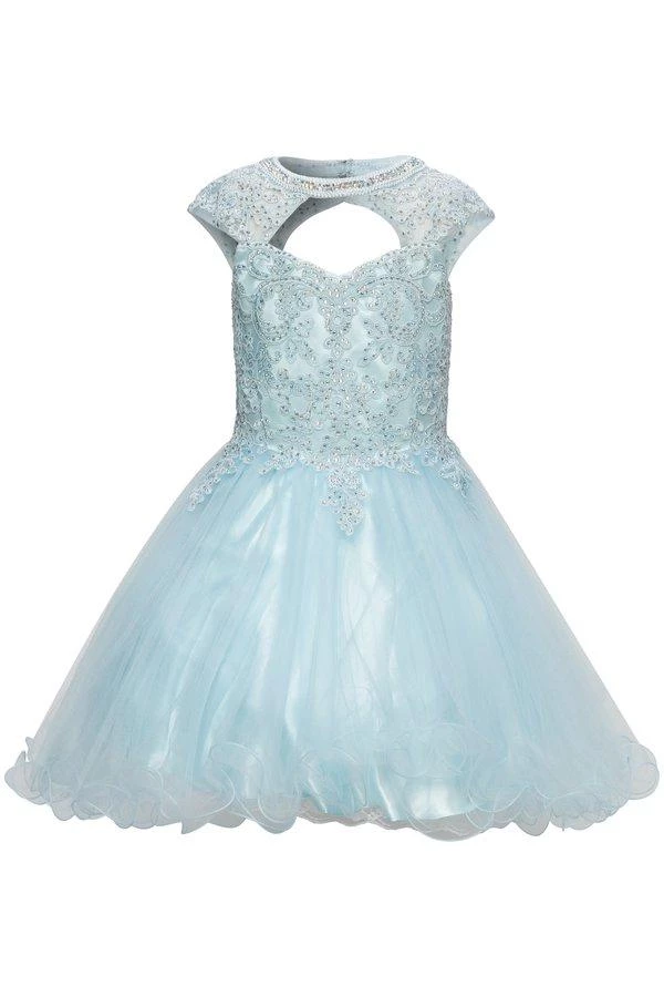 Your sweet girl will be selfie ready in this short ruffled dress with beaded lace bodice by Cinderella Couture 5083. Short sleeveless sweetheart dress embroidered with lace appliques accented with sparkly beads, short A-line skirt with a curly hemline, open back with cutout, and a lace-up corset back.