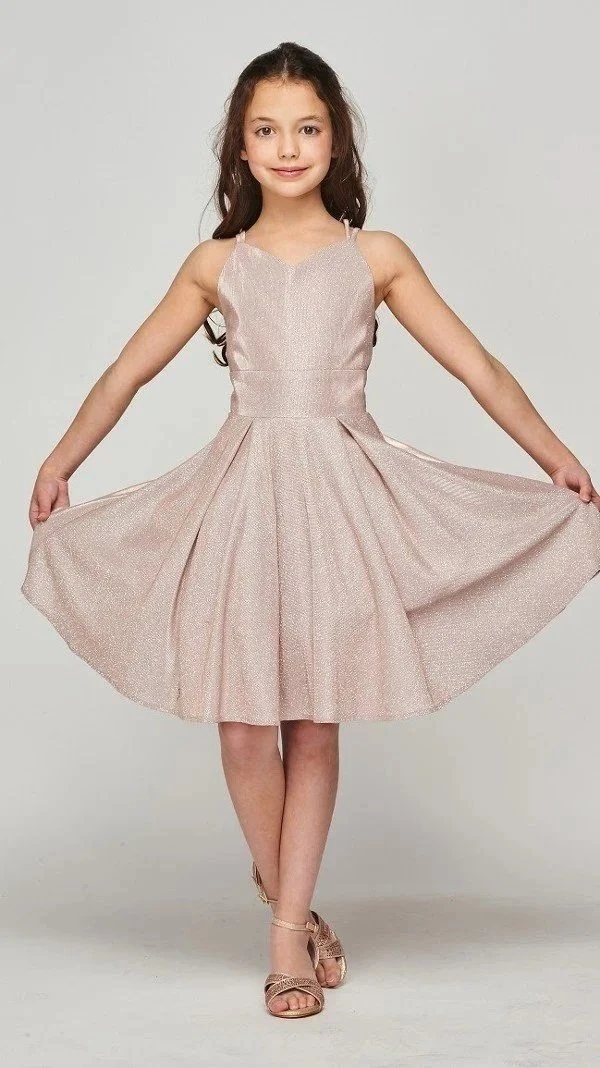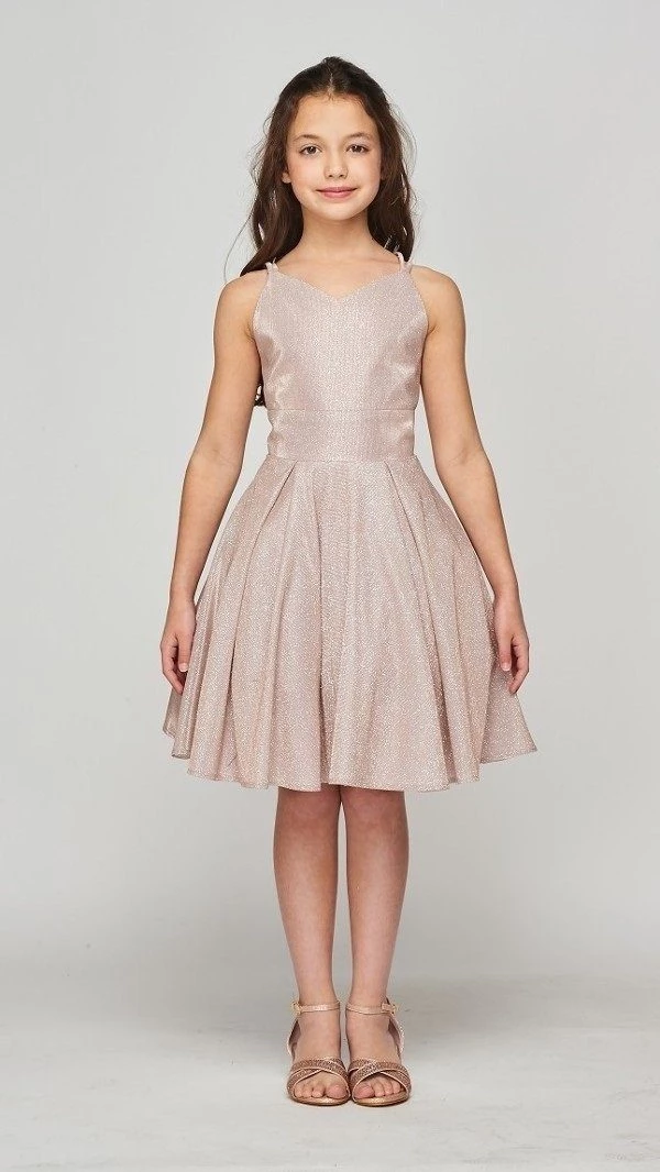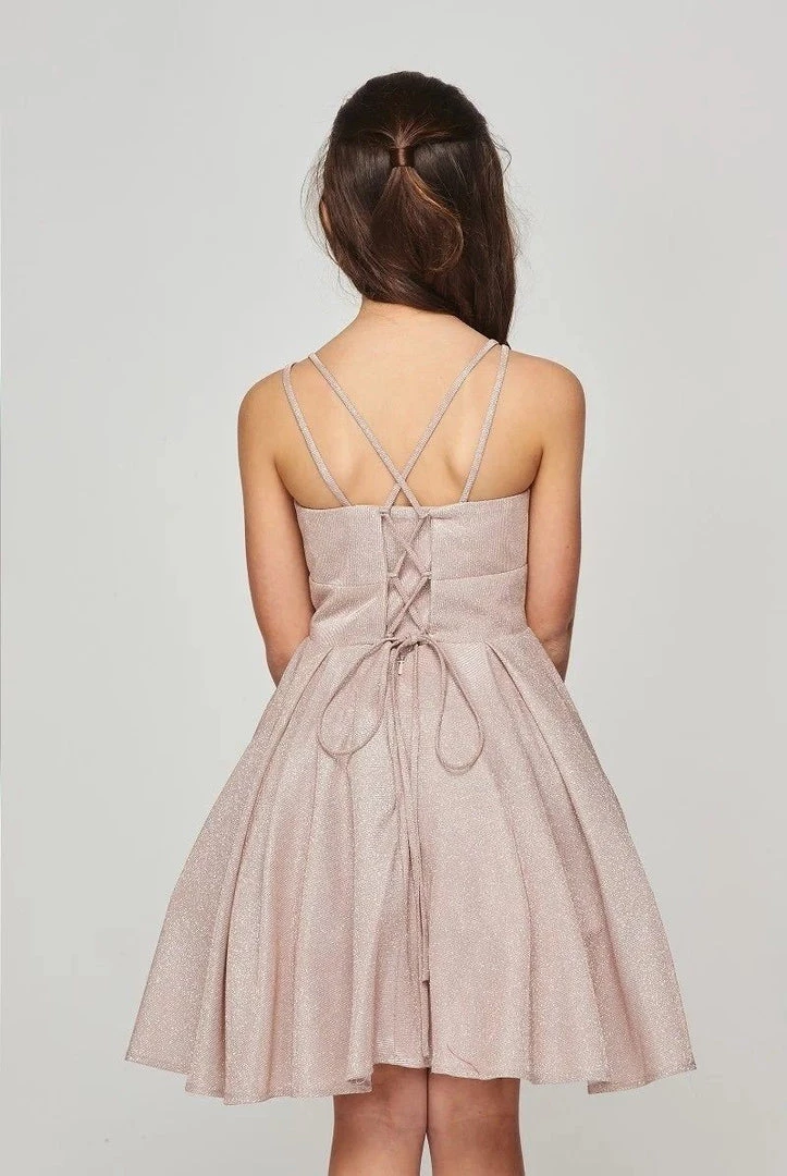 Your sweet girl will light up the room in this short A-line metallic glitter dress with lace-up back by Cinderella Couture 8011. This short party dress features a sleeveless sweetheart fitted bodice with double spaghetti straps, short A-line skirt, and a lace up corset back.