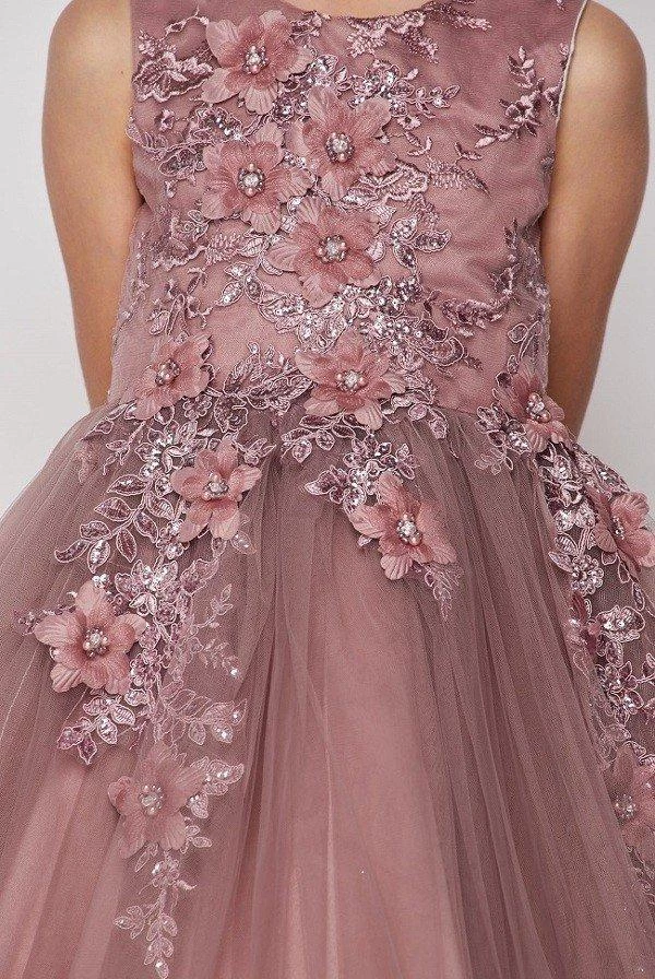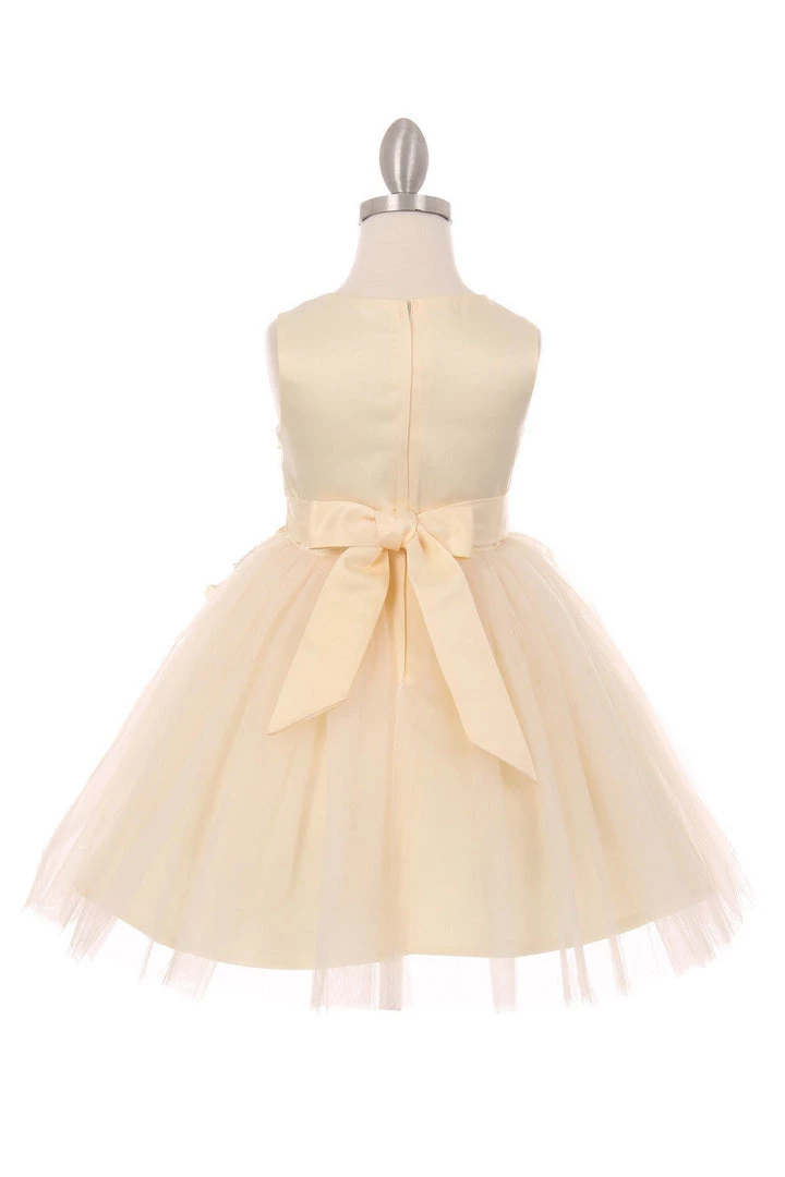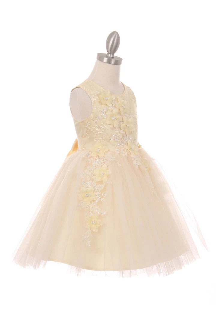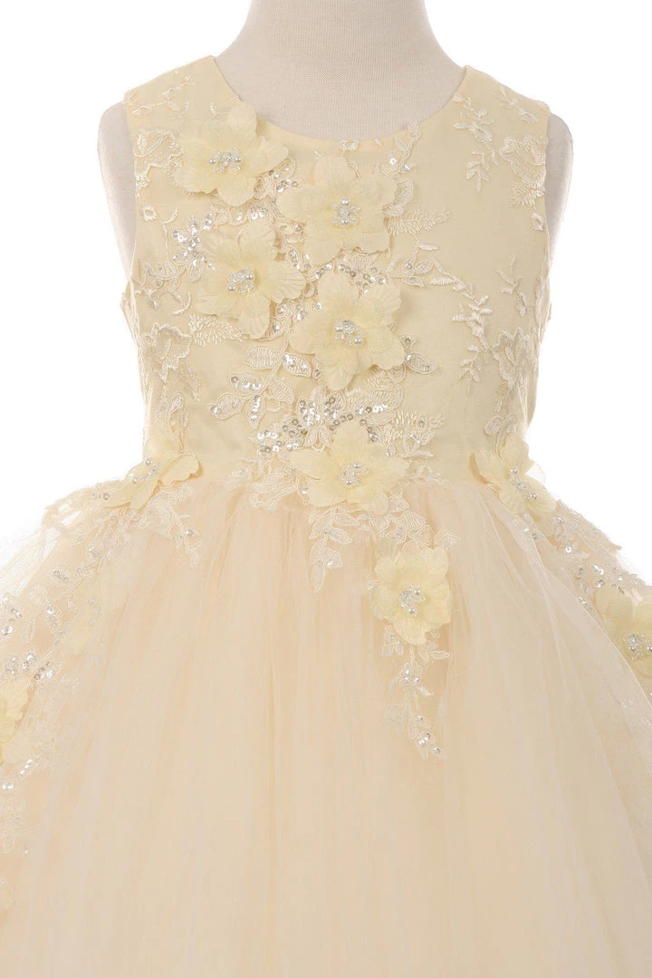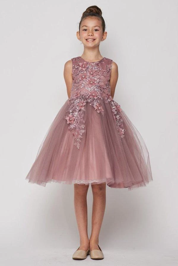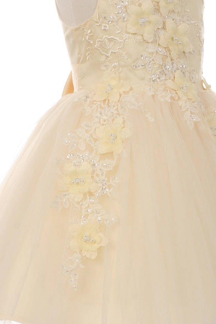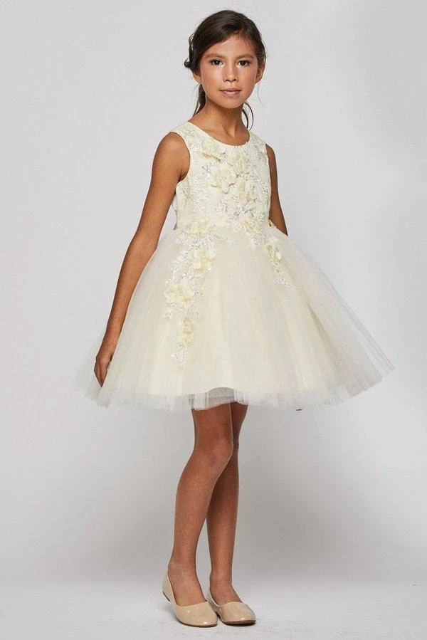 Your sweet girl will look picture-perfect in this short tulle dress with 3-dimensional flowers by Cinderella Couture 9040. This elegant dress features a sleeveless bodice adorned with 3D floral appliques accented with lovely beads, short A-line tulle skirt, and a back sash with a zipper closure.