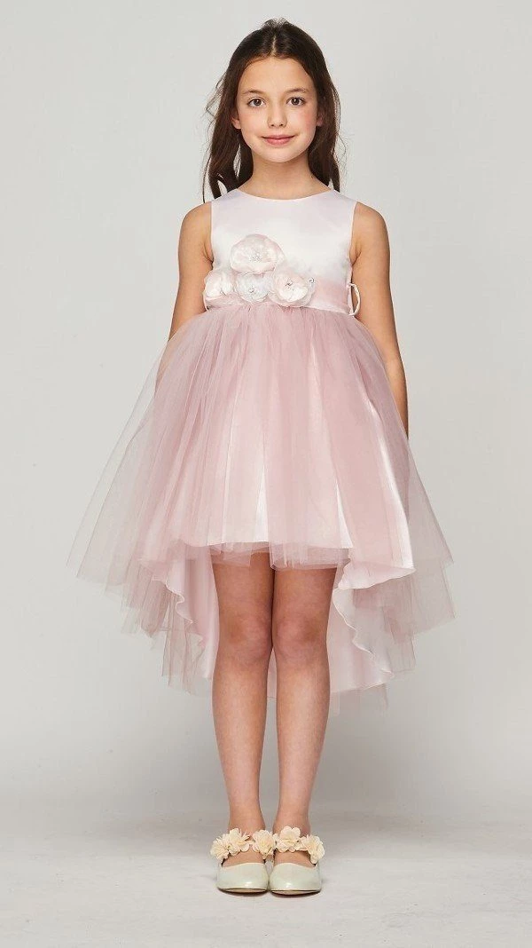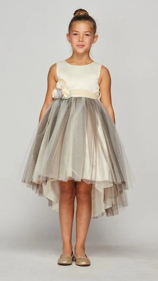 Your sweet girl will look picture-perfect in this two-tone high low dress with A-line tulle skirt by Cinderella Couture 5097. Elegant two tone dress with pearl beaded flower corsage and tulle sash back.