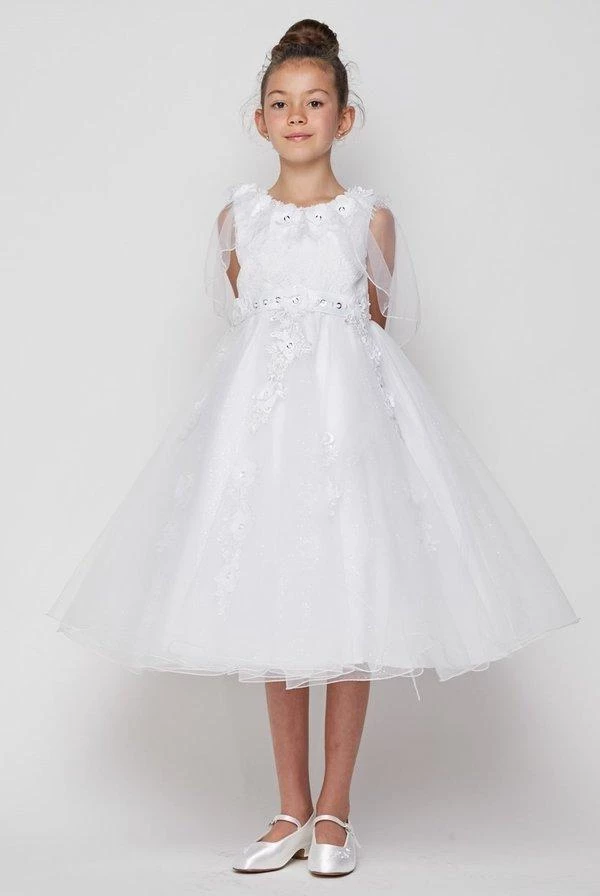 Your sweet girl will look timeless in this white applique cape dress with tulle tea length skirt by Cinderella Couture 2906. Sleeveless lace top dress, overlaid with tulle organza poncho style, accentuated waistline with rhinestone and flowers, tulle skirt adorned with 3D flowers, back tie for better fitting and maximum comfort, and a zipper closure.