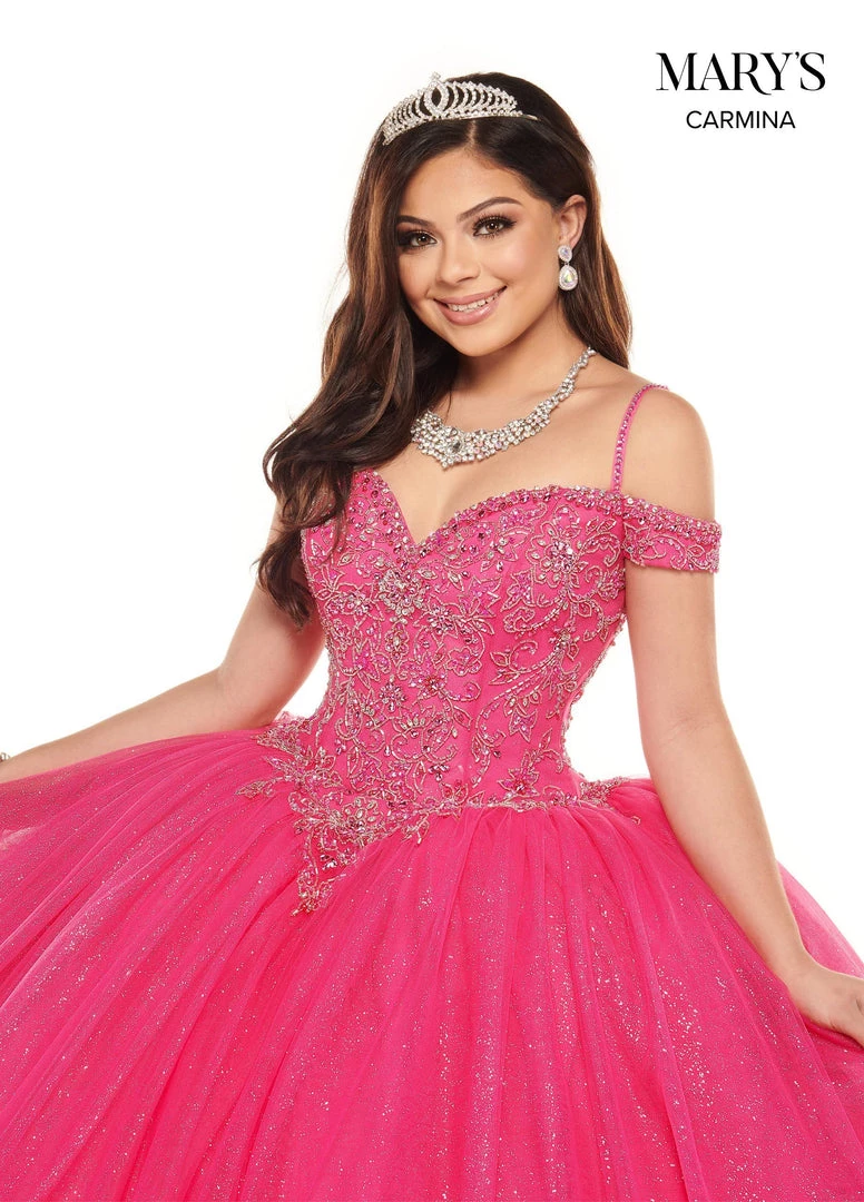 Look picture-perfect in this beaded long cold shoulder dress with A-line glitter tulle skirt by Mary’s Bridal Quinceanera MQ1072. Glitter tulle ball gown with an off-the-shoulder neckline, beaded straps and a fully beaded bodice with metallic details. The gown finishes with a basque waistline, corset back, and a sweep train. The matching tulle cape is included.