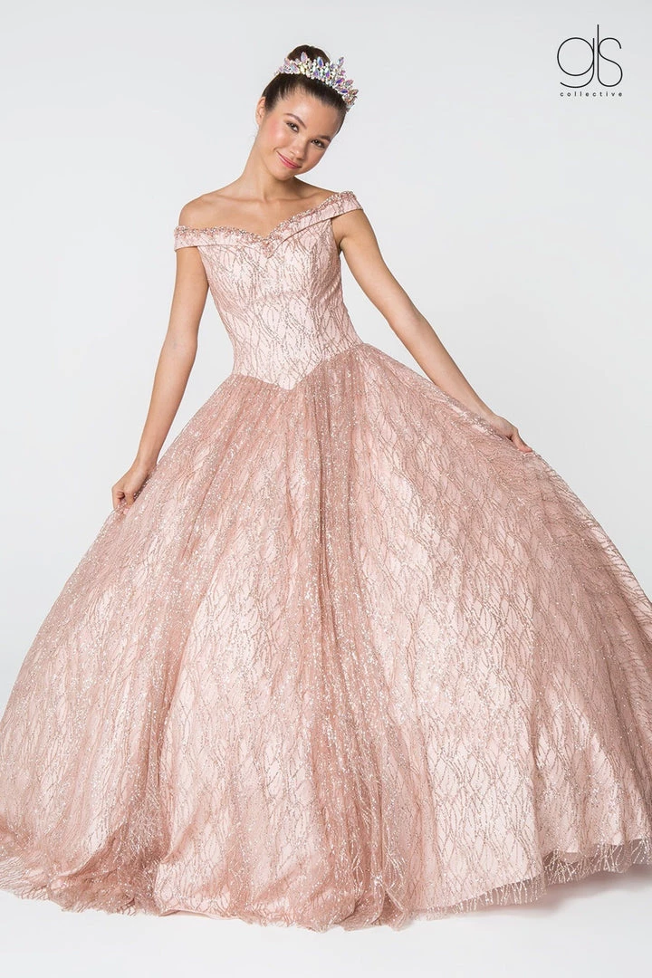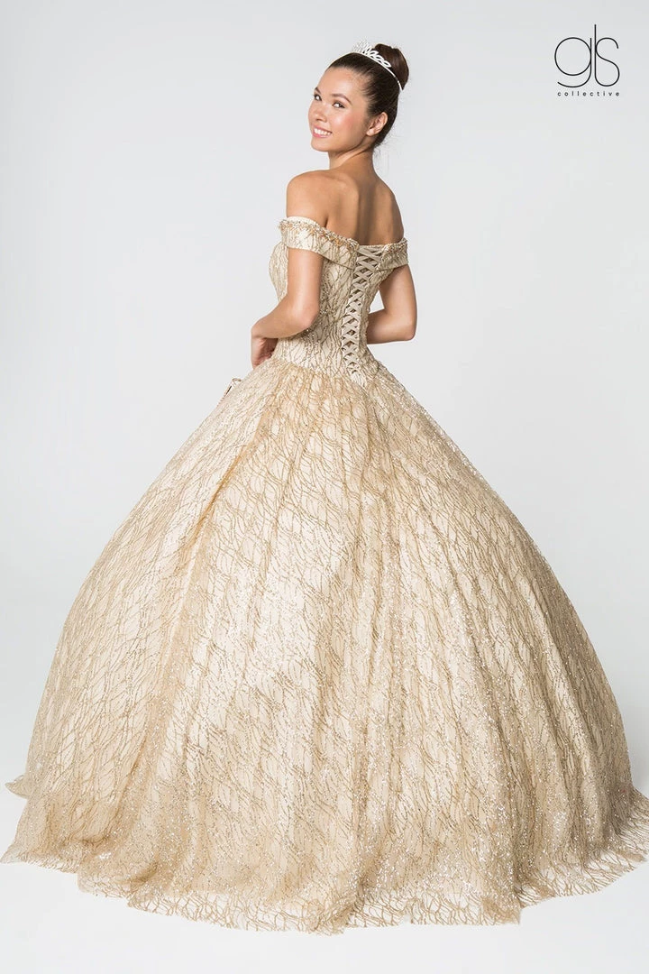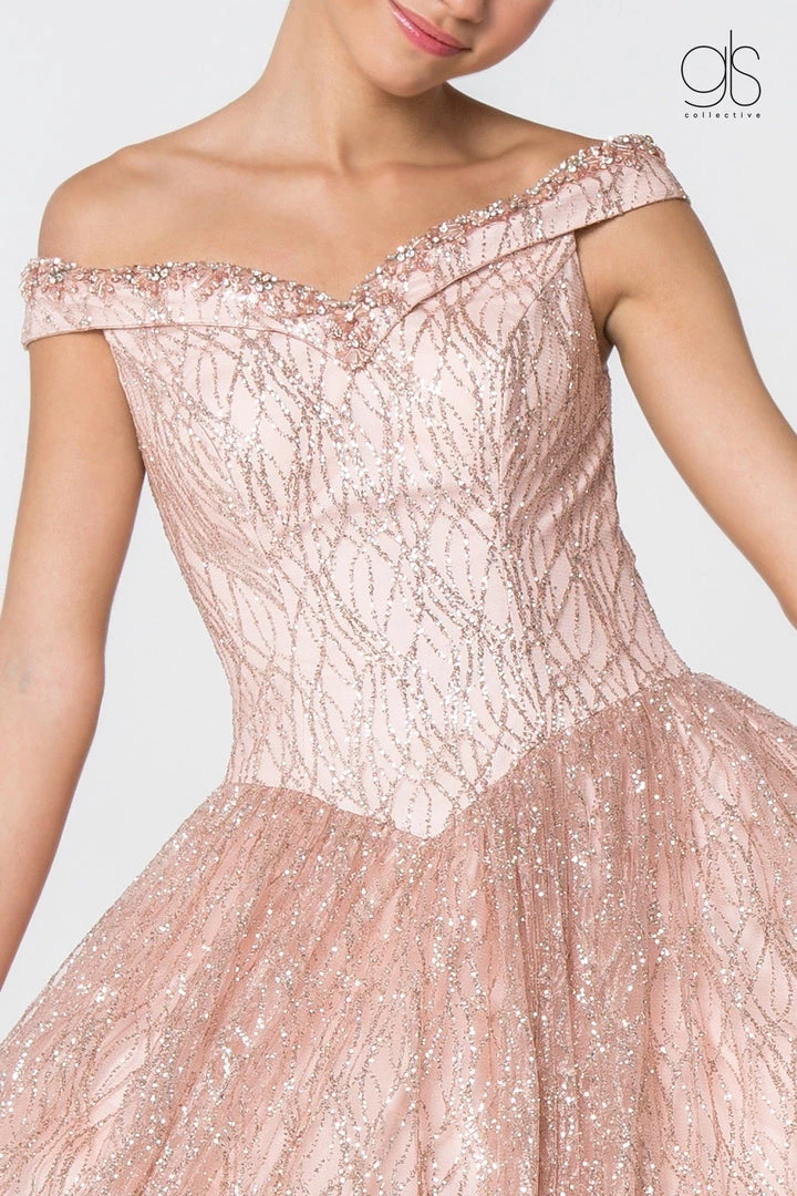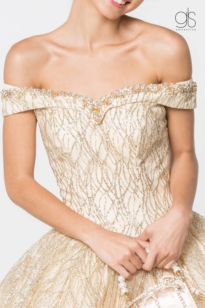 Light up the room in this long off the shoulder glitter pattern dress with A-line skirt by Elizabeth K GL2832.