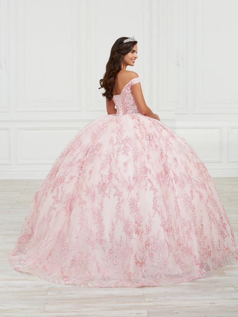 Be selfie ready in this glitter floral print long off the shoulder dress with A-line skirt by House of Wu Quinceanera Collection 26970. Made out of tulle, this beautiful off shoulder ball gown features a V-neck bodice adorned with sparkly glitter floral appliques, short sleeves, open back, and a floor length A-line skirt with floral glitter appliques allover. This look is finished with a lace-up corset back and a sweep train.