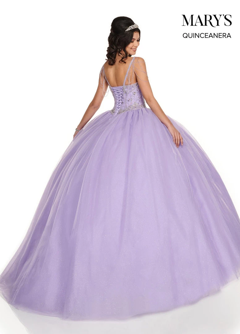 Light up the room in this beaded long sleeveless dress with A-line glitter skirt by Mary’s Bridal Quinceanera MQ1053. Radiant glitter tulle ball gown with a sweetheart neckline, chandelier beaded straps, and a fully crystallized bodice. The gown finishes with a sweep train, lace up back closure, and a matching cape.