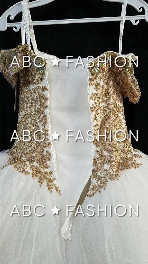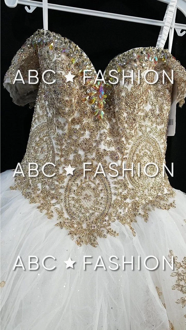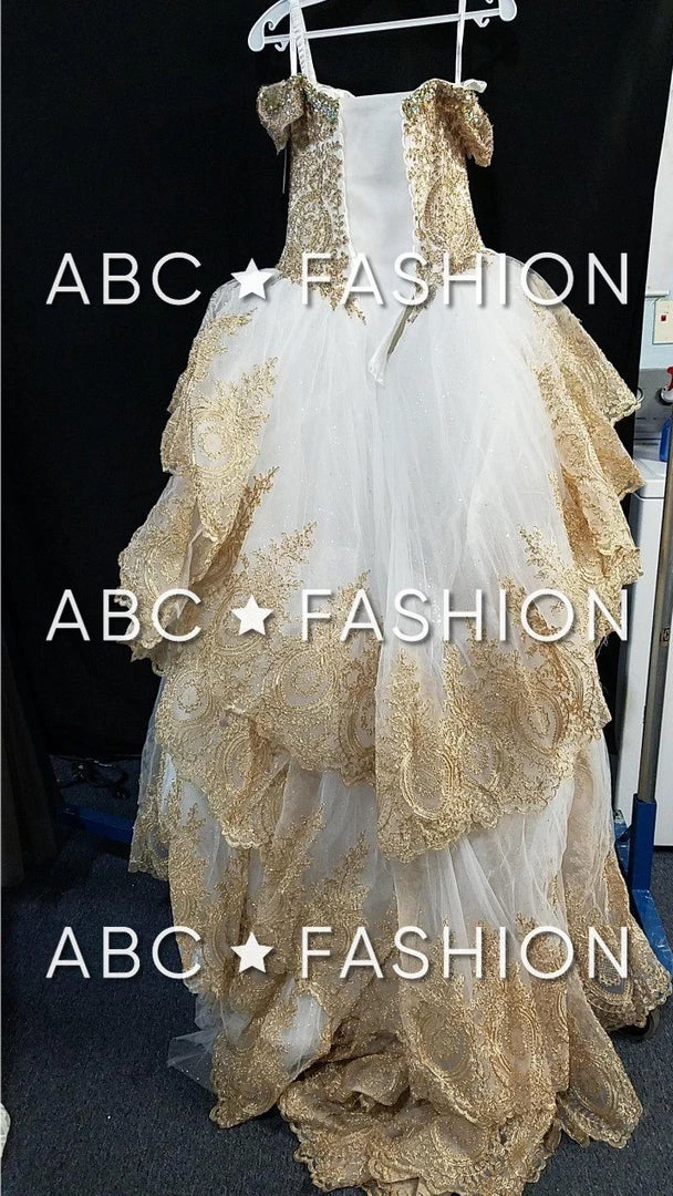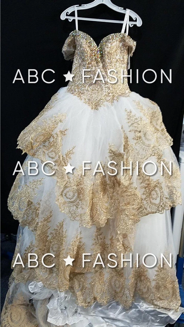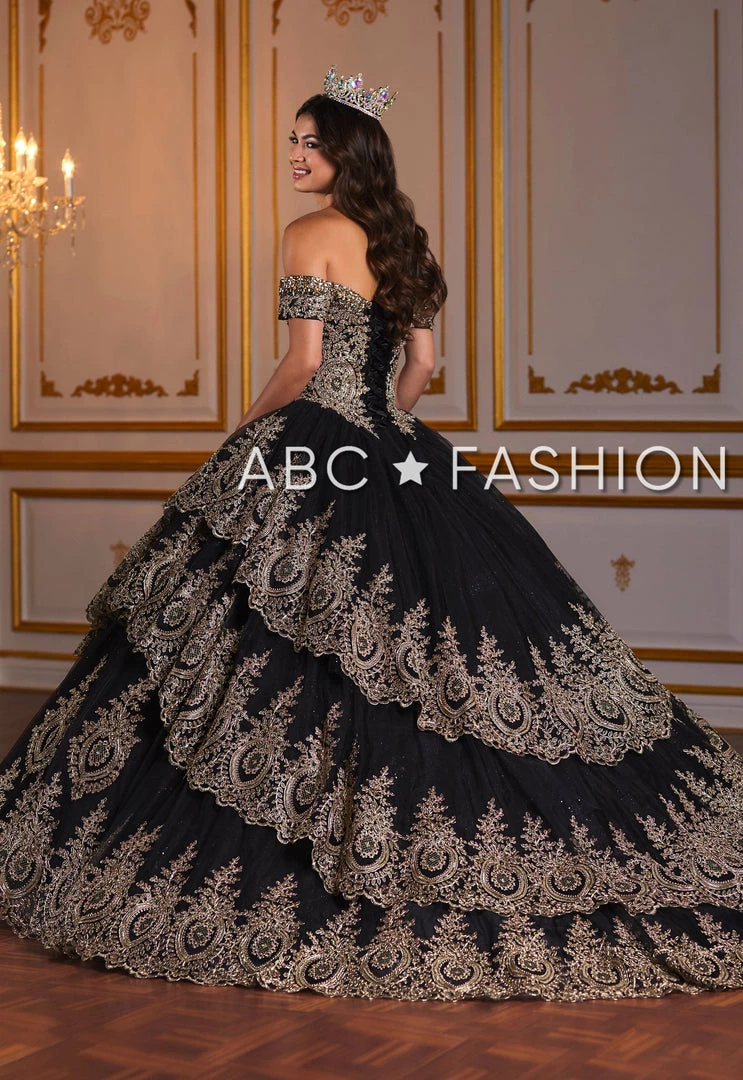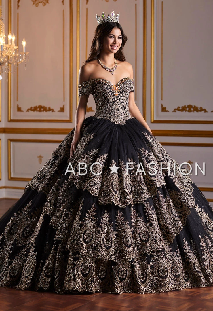 Impress your guests in this lace appliqued long off the shoulder dress with A-line skirt by House of Wu Quinceanera Collection 26934. Have a bold moment in this gorgeous off the shoulder ball gown. The sweetheart bodice is accented with gold lace appliques for a touch of drama. This look is finished with a corset back and a sweep train.