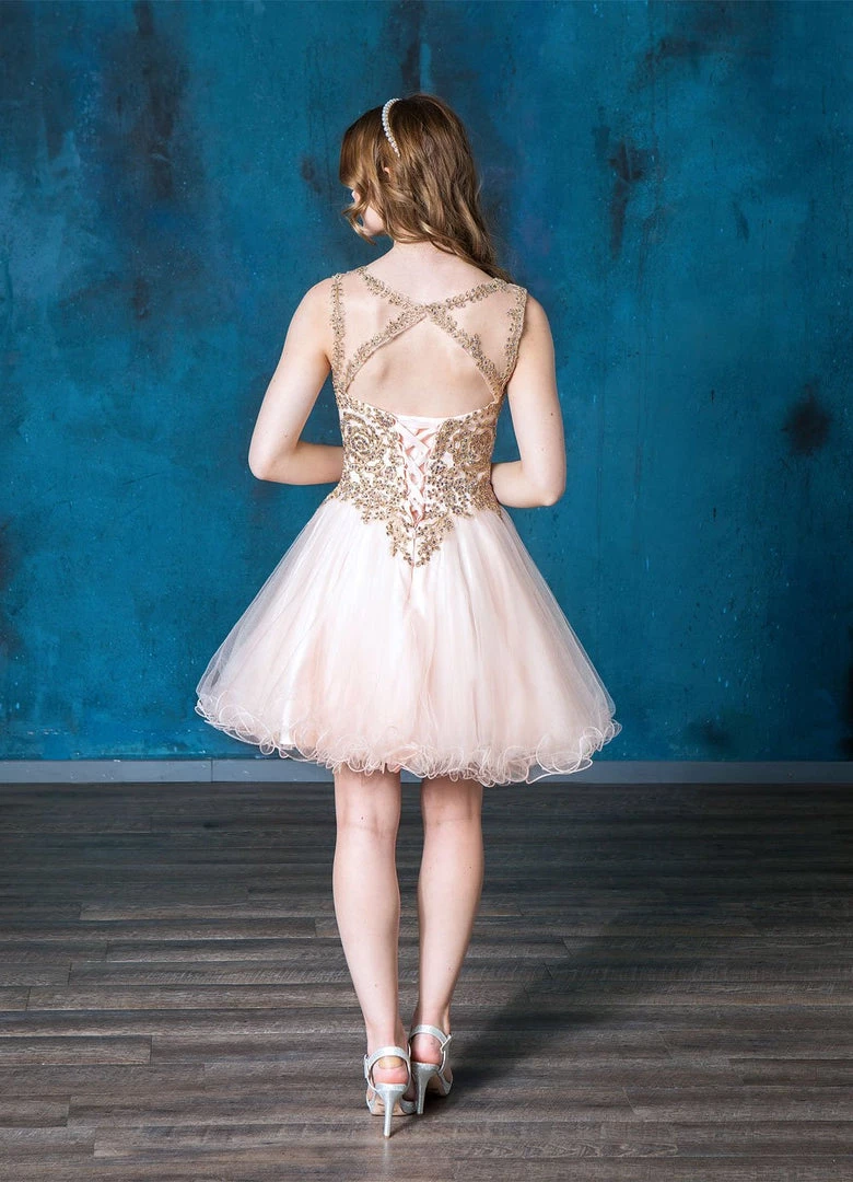Be selfie ready in thisĀ metallic lace appliqued short sleeveless tulle dress with A-line ruffled skirt by Calla Collection. This cocktail dress features a sleeveless illusion bodice adorned with beaded appliques, open back with keyhole cutout, short A-line skirt with curly hemline, and a lace-up corset back.