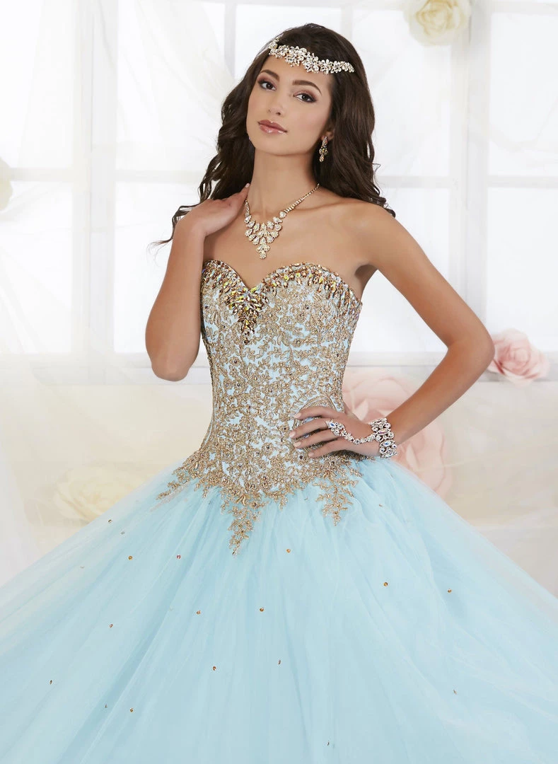 Look stunning in this gold appliqued long strapless sweetheart dress with A-line skirt by House of Wu Fiesta Gowns Collection 56286. A true eye-catching ballgown made with shining gold embroidery accented with stones – all completed with a beautiful sweetheart neckline and lace-up back.