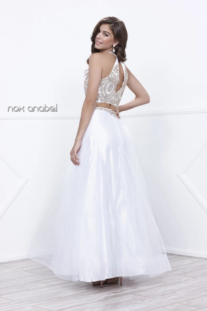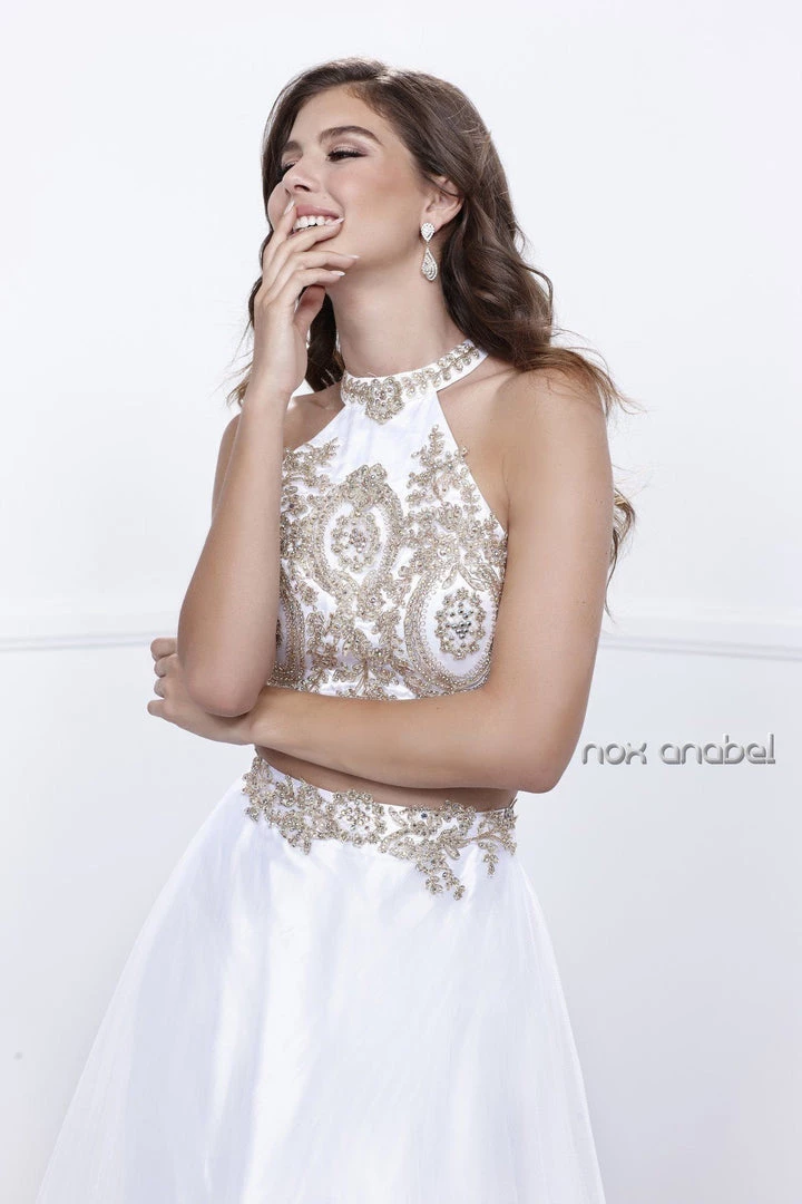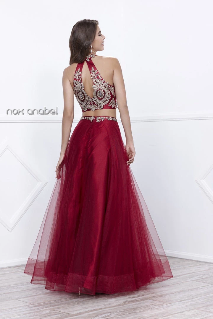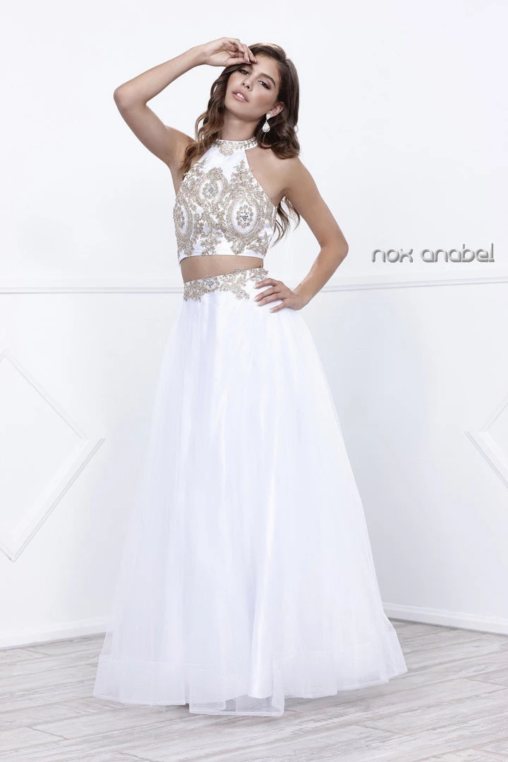 Be a trendsetter wearing this two-piece crop top floral embroidered dress by Nox Anabel 8205 at your upcoming formal event. This long evening gown features a high-neck halter crop with beautiful gold embroidered appliques, embellished neckline and waistline, keyhole back, long elegant skirt, and a zipper closure.