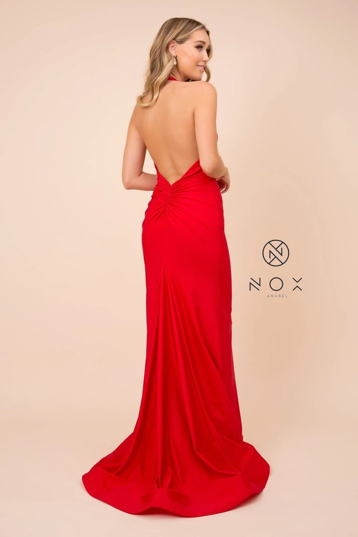 All eyes will be on you in this long halter mermaid dress with sweep train by Nox Anabel C421.
