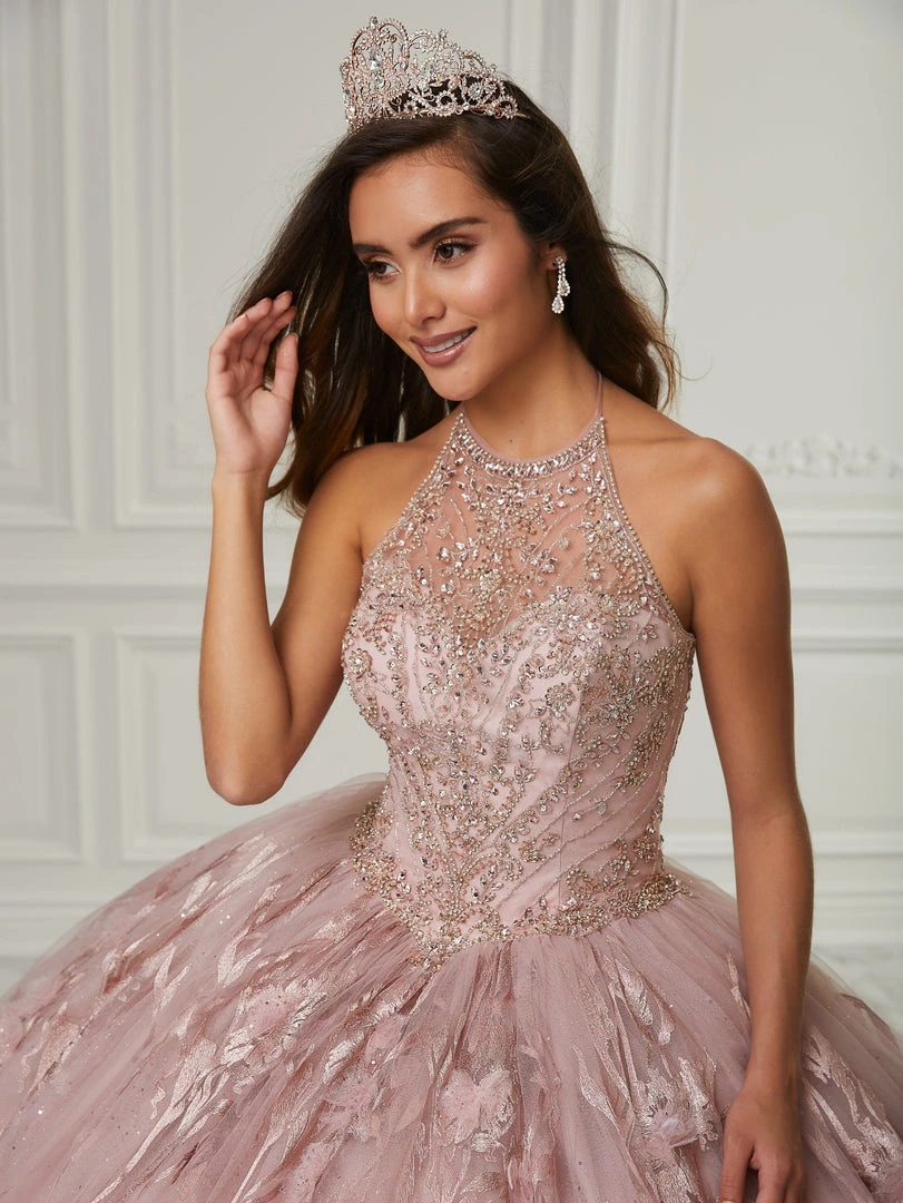 Light up the room in this long illusion halter dress with A-line skirt by House of Wu Quinceanera Collection 26987. Made out of tulle, this beautiful sleeveless ball gown features a sheer halter bodice adorned with sparkly beads, and metallic embroidery over-lace A-line skirt, This look is finished with a lace-up corset back and a sweep train.