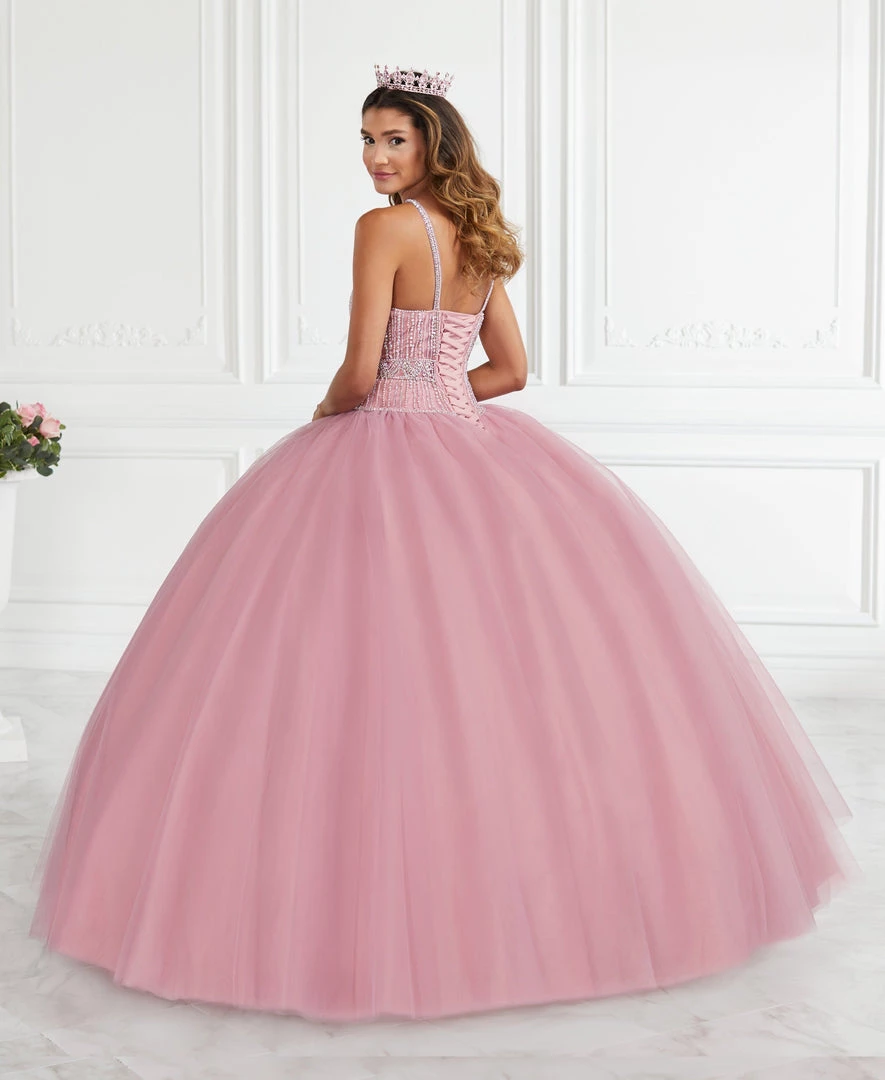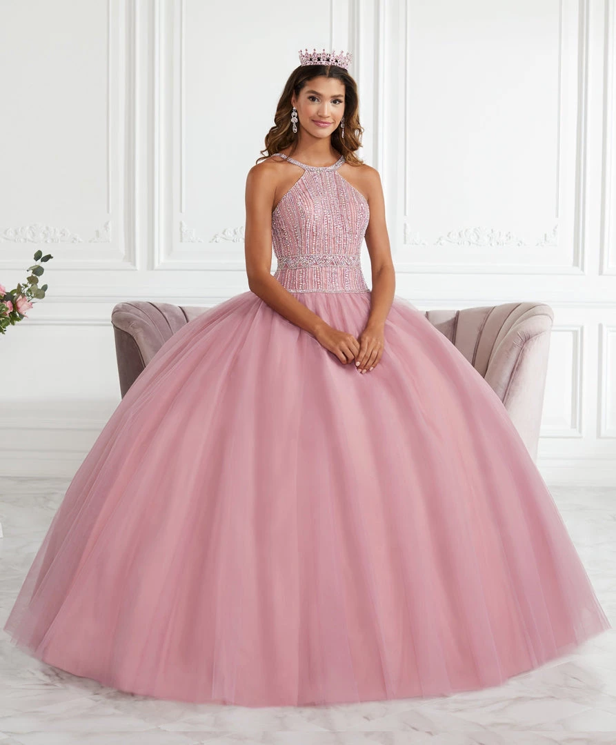 Look breathtaking in this beaded halter ball gown with A-line skirt by House of Wu Fiesta Gowns Collection 56391. Made out of tulle, this beautiful dress features a halter bodice adorned with sparkly beads, beaded collar neckline, layers of tulle form the ball gown skirt, open back with beaded shoulder straps, and lace-up back detail.