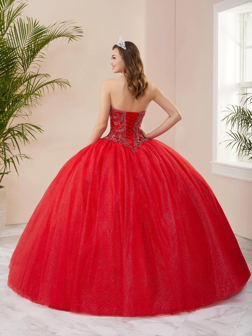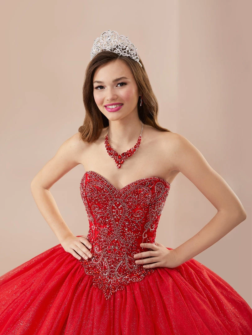 Look radiant in this beaded strapless sweetheart ball gown with A-line glitter tulle skirt by House of Wu Fiesta Gowns Collection 56403. Made out of glitter tulle, this beautiful long dress features a strapless sweetheart bodice covered in sparkly beads, tulle and glitter tulle ball gown skirt, open back, and a lace-up corset back.