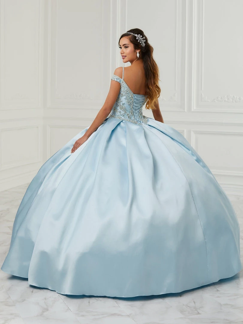 Captivate the room in this cold shoulder ball gown with A-line skirt by House of Wu Fiesta Gowns Collection 56429. Made out of mikado, this beautiful long cold shoulder dress features an off the shoulder neckline with beaded bodice and sleeve, box-pleated A-line mikado skirt, sweep train, open back, and lace-up corset back.