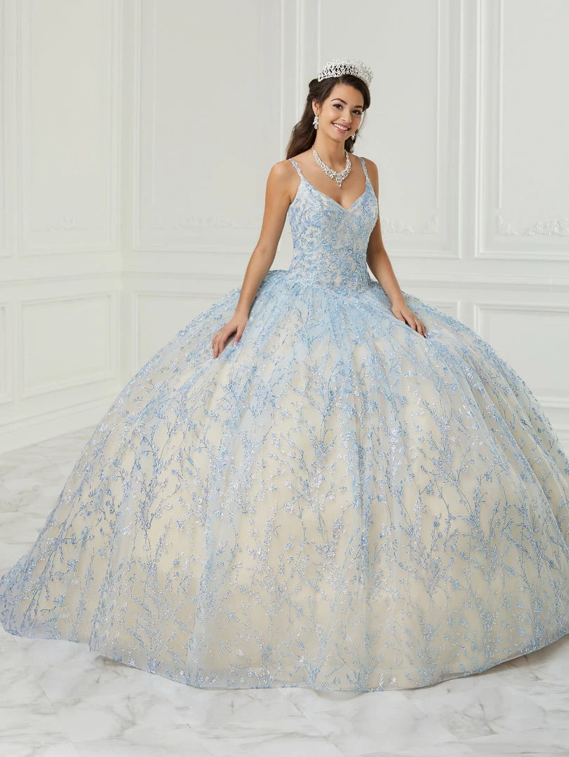 Be selfie ready in this glitter print V-neck ball gown with A-line skirt by House of Wu Fiesta Gowns Collection 56425. Made out of tulle, this beautiful long sleeveless dress features a V-neckline with straps, blossom glitter appliques detail bodice and ball gown skirt, sweep train, open back, and lace-up corset back.