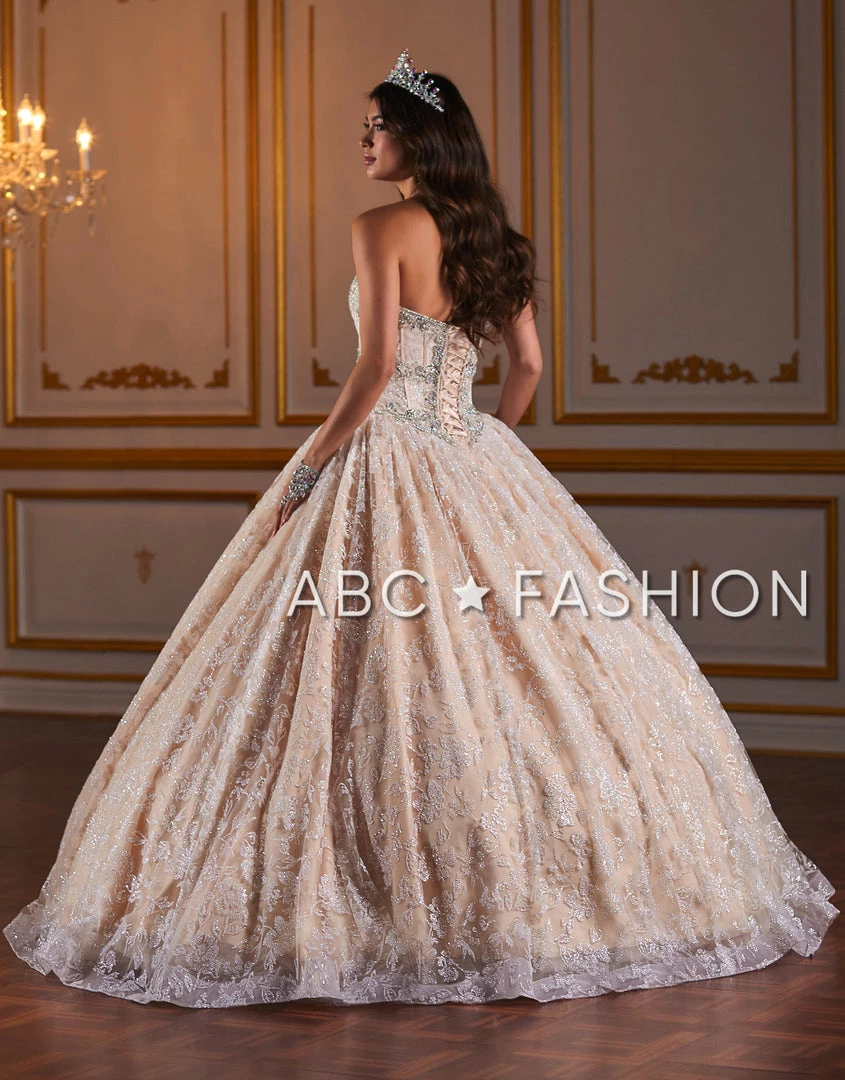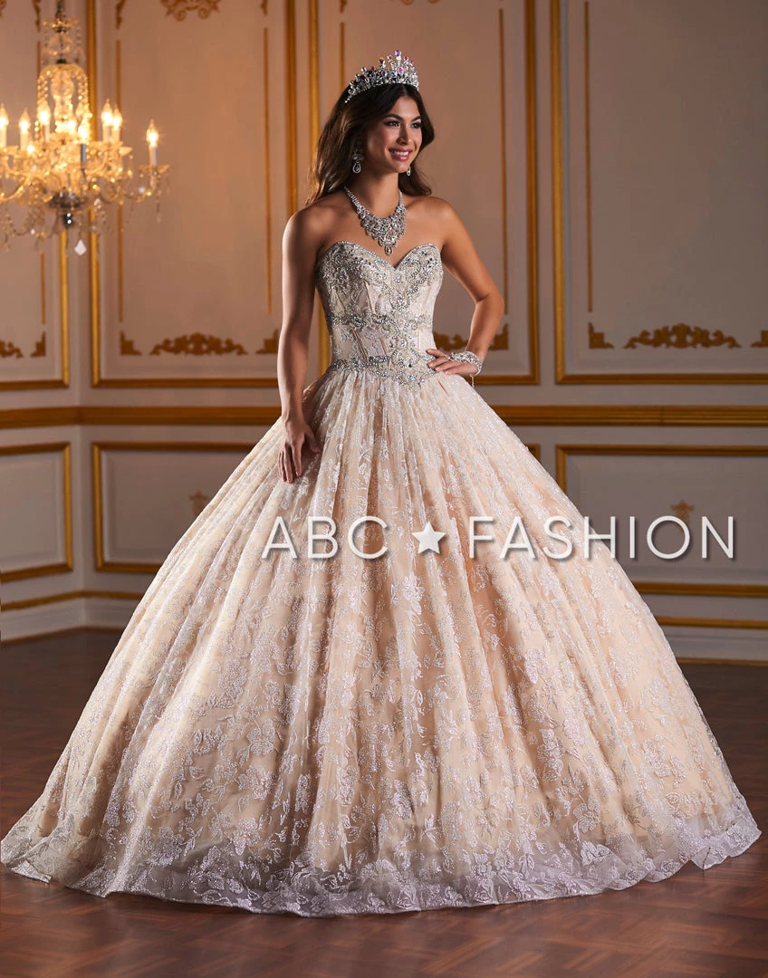 Look like a fairy-tale Princess in this metallic lace strapless sweetheart dress with A-line skirt by House of Wu Fiesta Gowns Collection 56375. Metallic lace ball gown featuring a basque waistline, beaded strapless sweetheart bodice and expose boning. This look is finished with a corset back.
