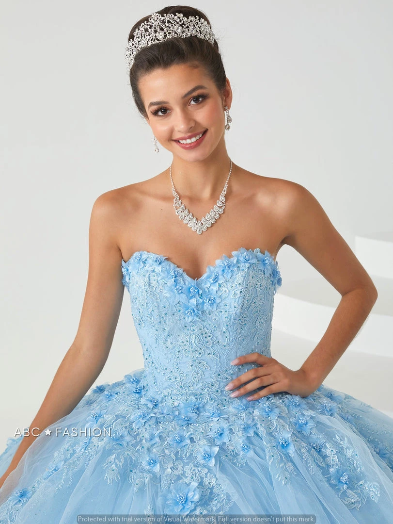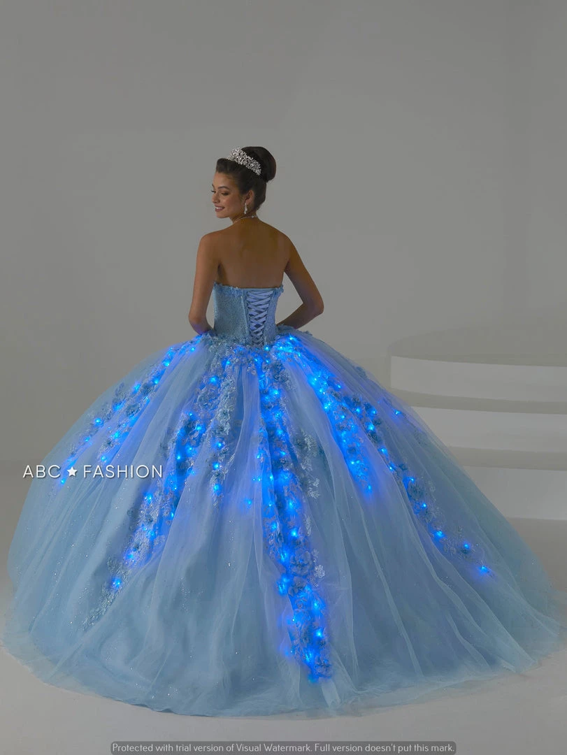 Captivate the room in this 3D floral applique long dress with A-line shimmer tulle by House of Wu Fiesta Gowns 56432. This ball gown features a sweetheart neckline adorned with floral appliques bodice and skirt. The fully gathered tulle skirt with three dimensions flowers and lace detail with led light, a lace-up corset up and sweep train. Comes with lights.