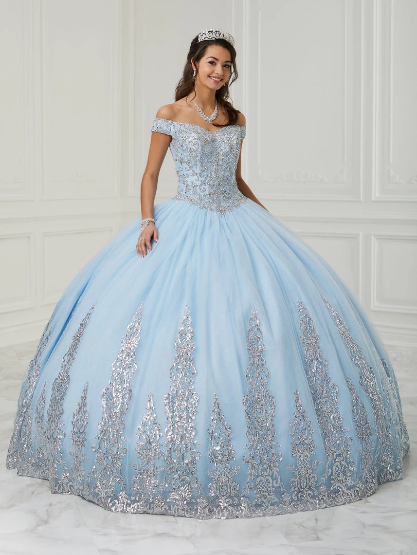 Look radiant in this off the shoulder ball gown with A-line skirt by House of Wu Fiesta Gowns Collection 56423. Made out of tulle, this beautiful long off the shoulder dress features a sweetheart neckline with short sleeves, beaded bodice, gathered tulle ball gown skirt finished with sequins floral lace hemline, sweep train, open back, and lace-up corset back.