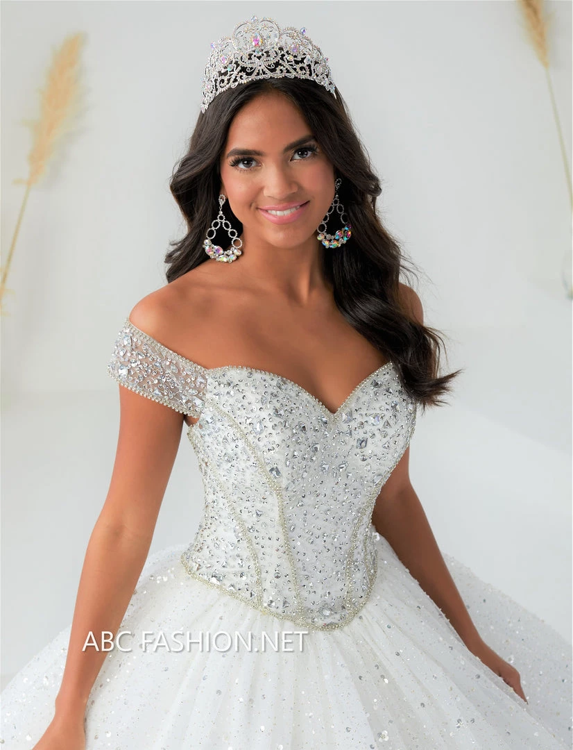 Look breathtaking in this off shoulder dress with A-line glitter tulle by House of Wu Fiesta Gowns 56452. Enjoy your princess moment in our off-the-shoulder ball gown designed with a handsewn beaded bodice and short sleeves. The full ball gown skirt is crafted of a gathered luxe mesh and accented with 3D hand beaded sequins. This dress features a sweetheart neckline and lace-up back and sweep train.