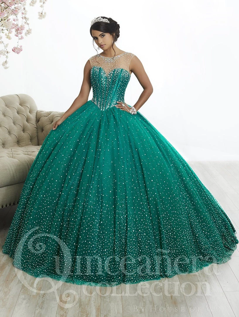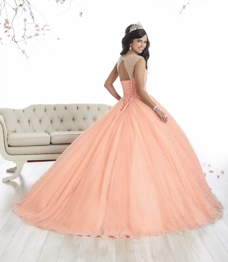 Look unforgettable in this beaded illusion A-line dress by House of Wu Style Number 26866 during your Quinceanera, Sweet 16 party, or for any formal event. Made out of mikado, every inch of this ball gown sparkles, from its beaded illusion straps, bodice, and skirt, to the underlay of sparkle tulle subtly shimmering beneath. Complete with lace-up back.