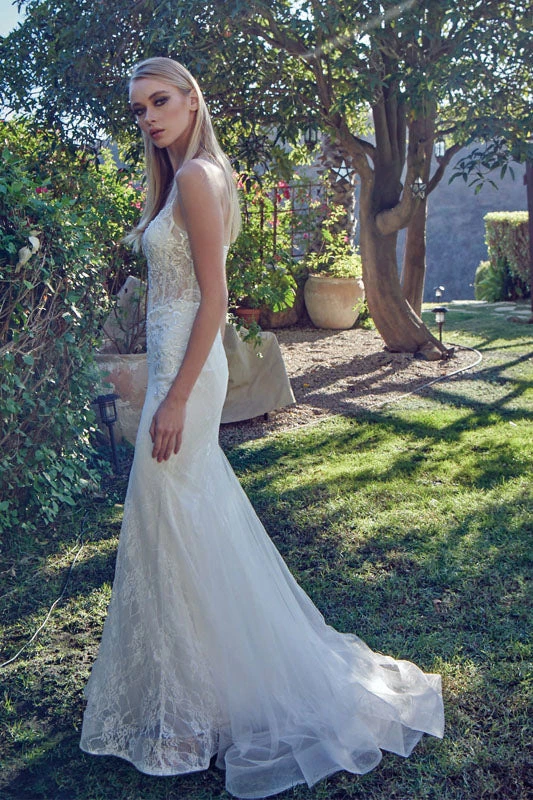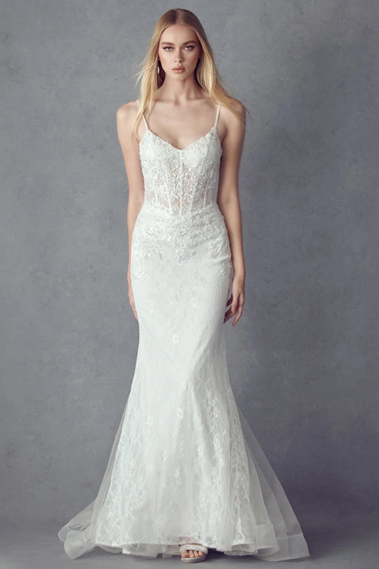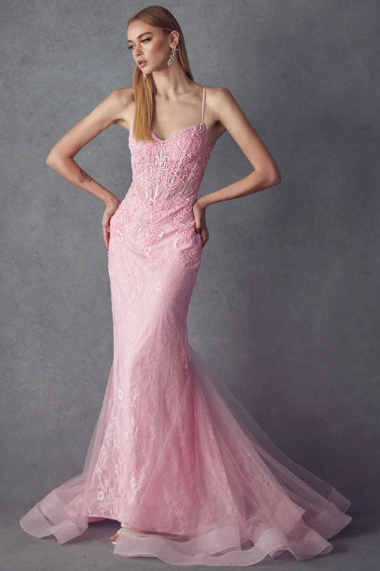 Make lasting memories in this long illusion lace bodice sleeveless dress with mermaid skirt by Juliet 250. This beautiful dress is embellished with illusion lace v-neckline with open lace-up back with adjustable ties and zipper closure with sweep train.