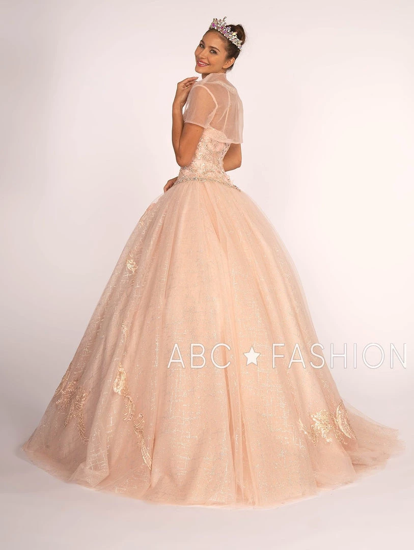 Create lasting memories in this long glitter dress with beaded illusion sweetheart bodice by Elizabeth K GL2600 during your Quinceanera party or for any formal event. This beautiful sleeveless gown features a sheer sweetheart neckline embellished with feminine beaded design, a flirty open back with straps, the glitter pattern and embroidered lace appliques on the floor length skirt makes a bold statement, gorgeous sweep train, and a lace-up corset back. This dress comes with a matching bolero jacket.
