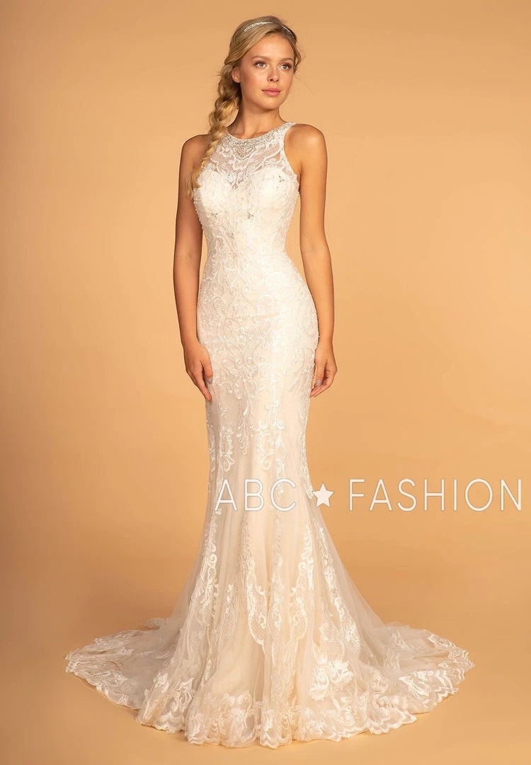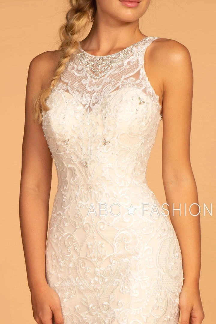 Dance the night away in this long lace appliqued illusion sleeveless dress with mermaid skirt by Elizabeth K GL2597 during your wedding or for any formal event. This beautiful sleeveless gown features a sheer sweetheart neckline adorned with elegant embroidered lace appliques, a jeweled details around the neckline, embellished sheer back, the floor length mermaid skirt is completed with a sweep train, and a cover button closure.