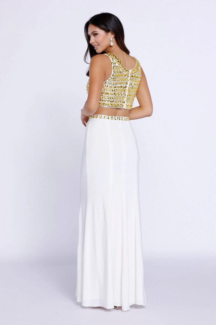 Rock this ivory sleeveless two-piece crop top gold beaded dress by Nox Anabel Style Number 8183 at your upcoming formal event. This long evening gown features a sleeveless tank crop-top adorned with sparkly gold beads, beaded waistline, beaded back, floor length skirt, and a zipper closure.