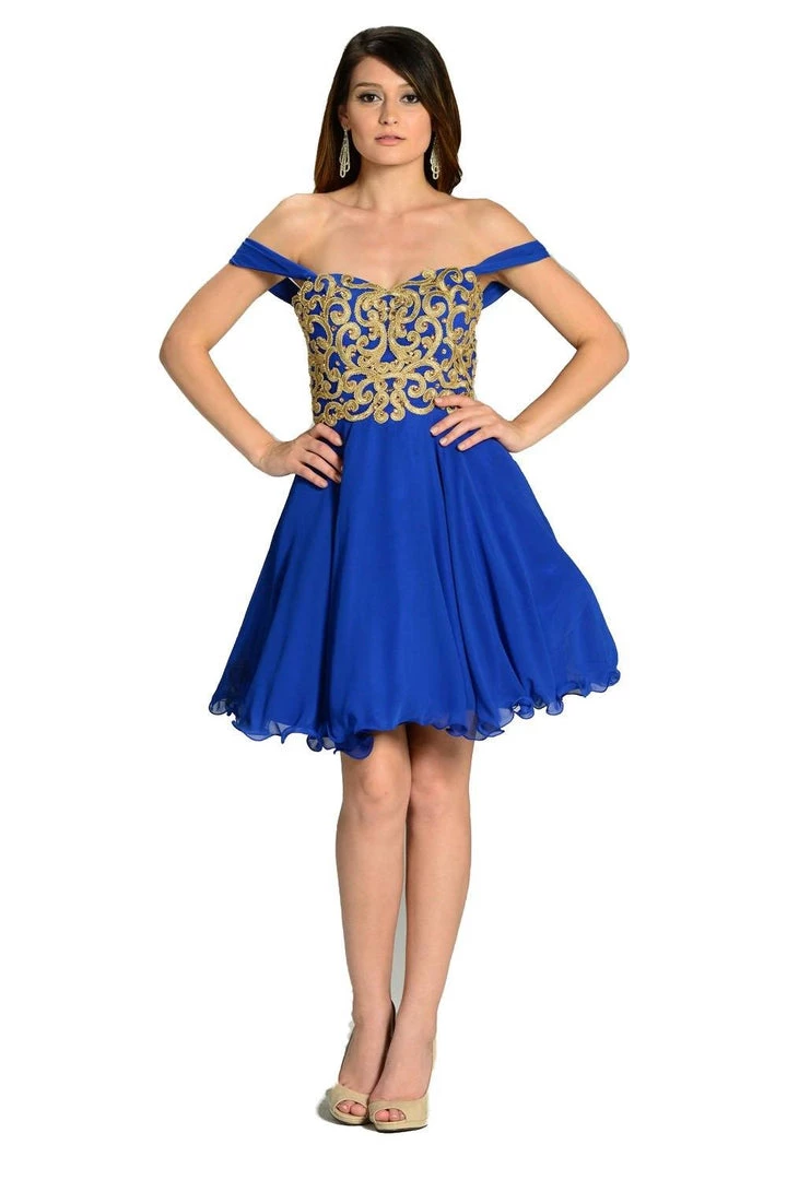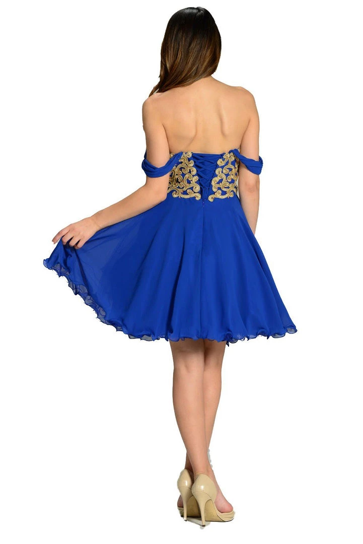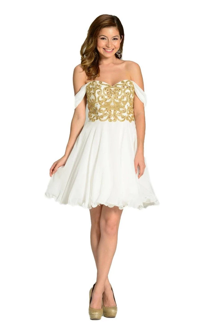 Be a trendsetter in this short ivory off the shoulder chiffon dress with gold lace appliqued bodice by Poly USA Style Number 7296. This versatile cocktail dress features a beautiful bodice embellished with gold lace applique and sparkly rhinestones, a short A-line hem rolled skirt, and a lace-up back. This dress comes with detachable shoulder straps, which allows you to easily change dress styles! Perfect for any semi-formal event!