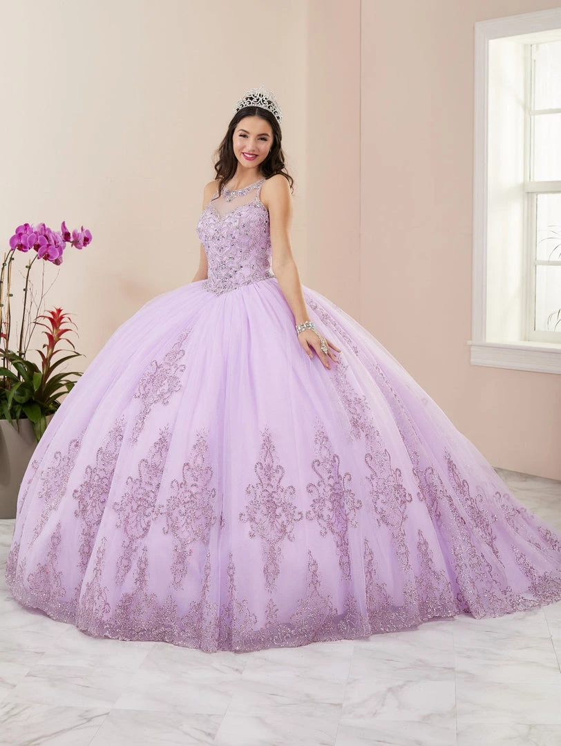Make a grand entrance in this jeweled long illusion sleeveless dress with A-line floral glitter print skirt by House of Wu Quinceanera Collection 26958. Made out of tulle, this beautiful sleeveless tank ball gown features a sheer sweetheart bodice adorned with sparkly jeweled beads, open back, and a floor length skirt embellished with cracked ice glitter floral appliques. This look is finished with a lace-up corset back and a sweep train.