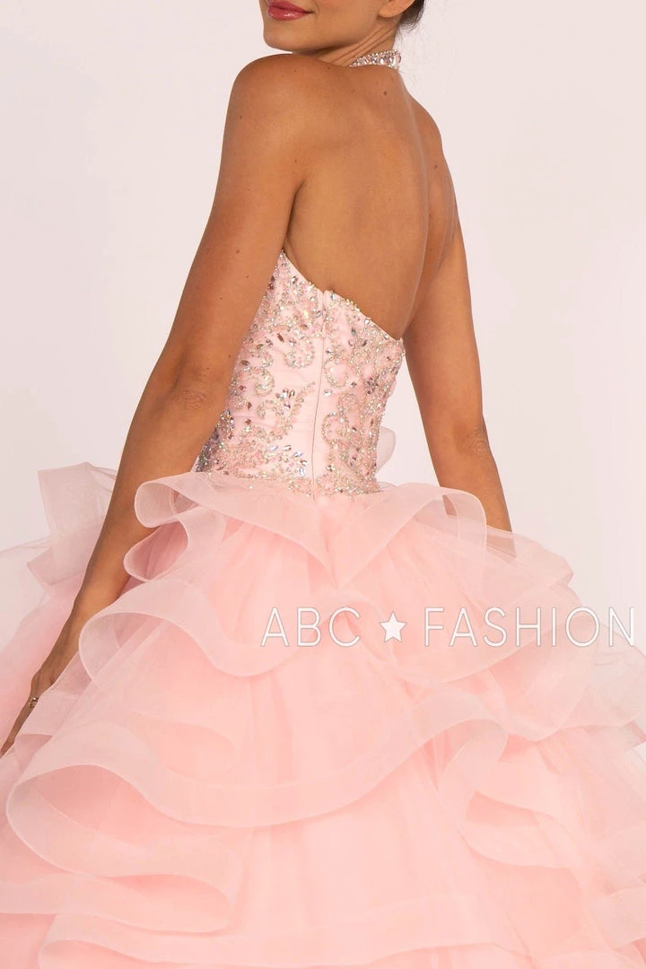 Be the center of attention in this long beaded illusion halter dress with layered skirt by Elizabeth K GL2512 during your Quinceanera party or for any formal event. This beautiful halter gown features a high-neckline adorned with sparkly beaded embellishments, flirty open back, the floor length skirt has gorgeous layered ruffles with horsehair hemline and is completed with a sweep train, and a lace-up corset back.